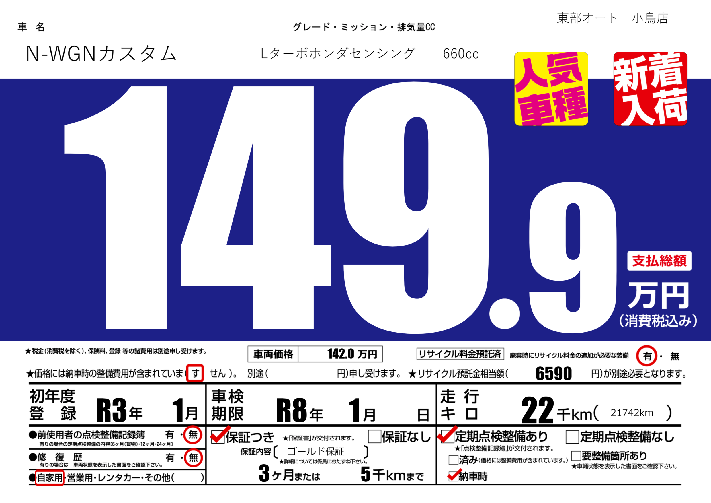 保証付き 保証内容( ゴールド保証) 3ヶ月または(5)千kmまで |