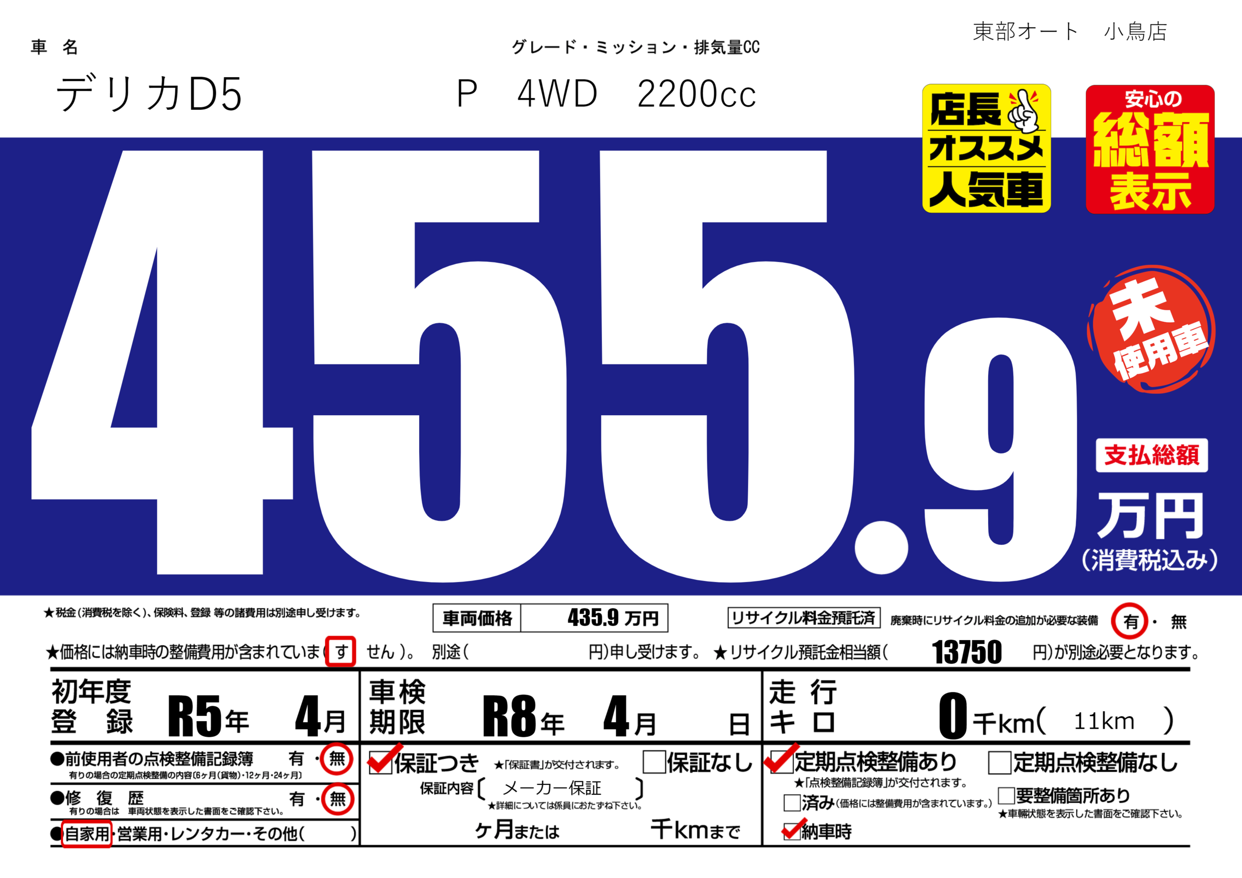 | 定期点検整備 | 定期点検整備あり 納車時あり | ||