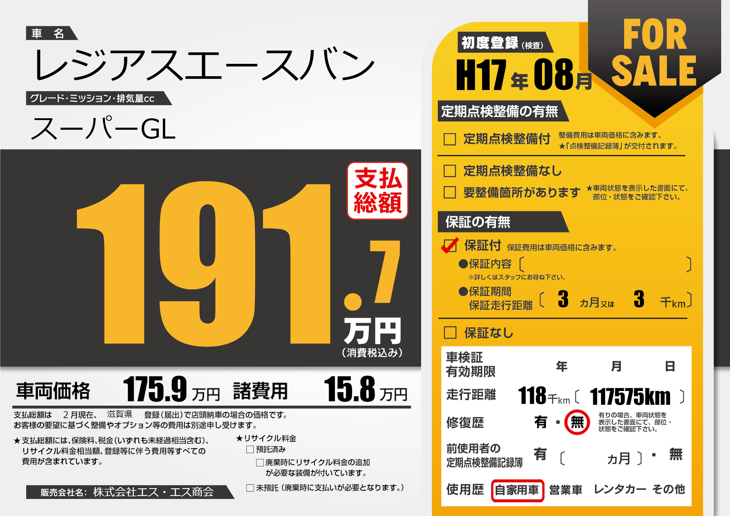 | 車名 | レジアスエースバン | グレード ミッション 排気量 |