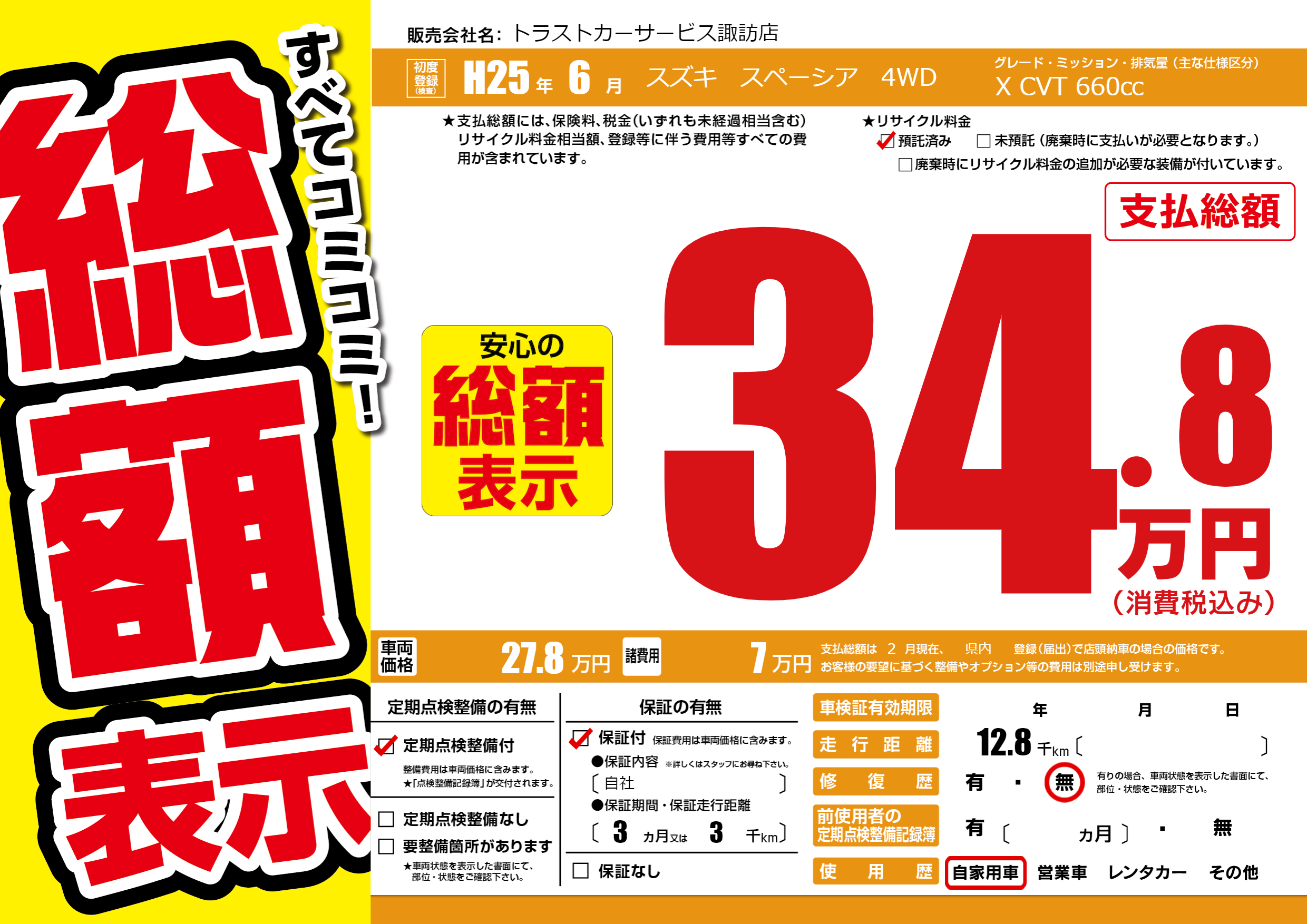 | 車名 | スズキ スペーシア 4WD | グレード ミッション 排気量 |