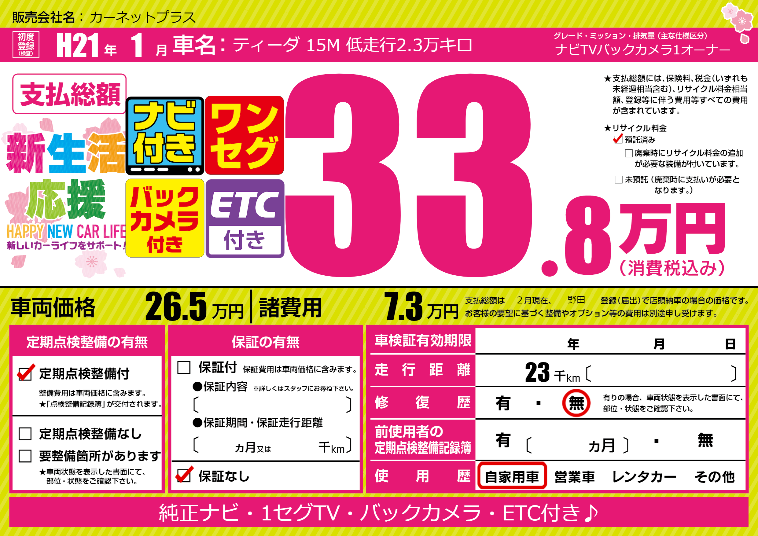 | 車名 | ティーダ 15M 低走行2.3万キロ | グレード ミッション 排気量 |