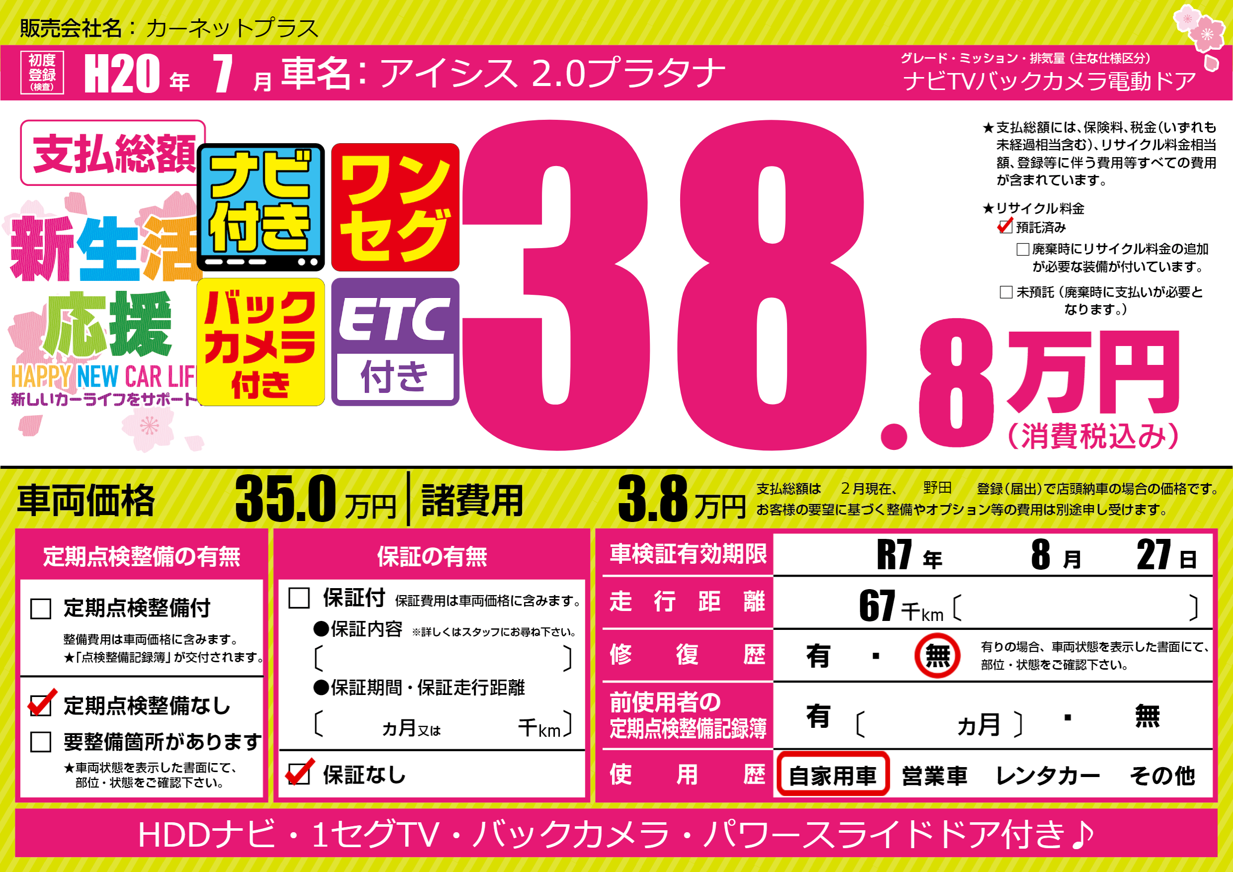 | 車名 | アイシス 2.0プラタナ | グレード ミッション 排気量 |