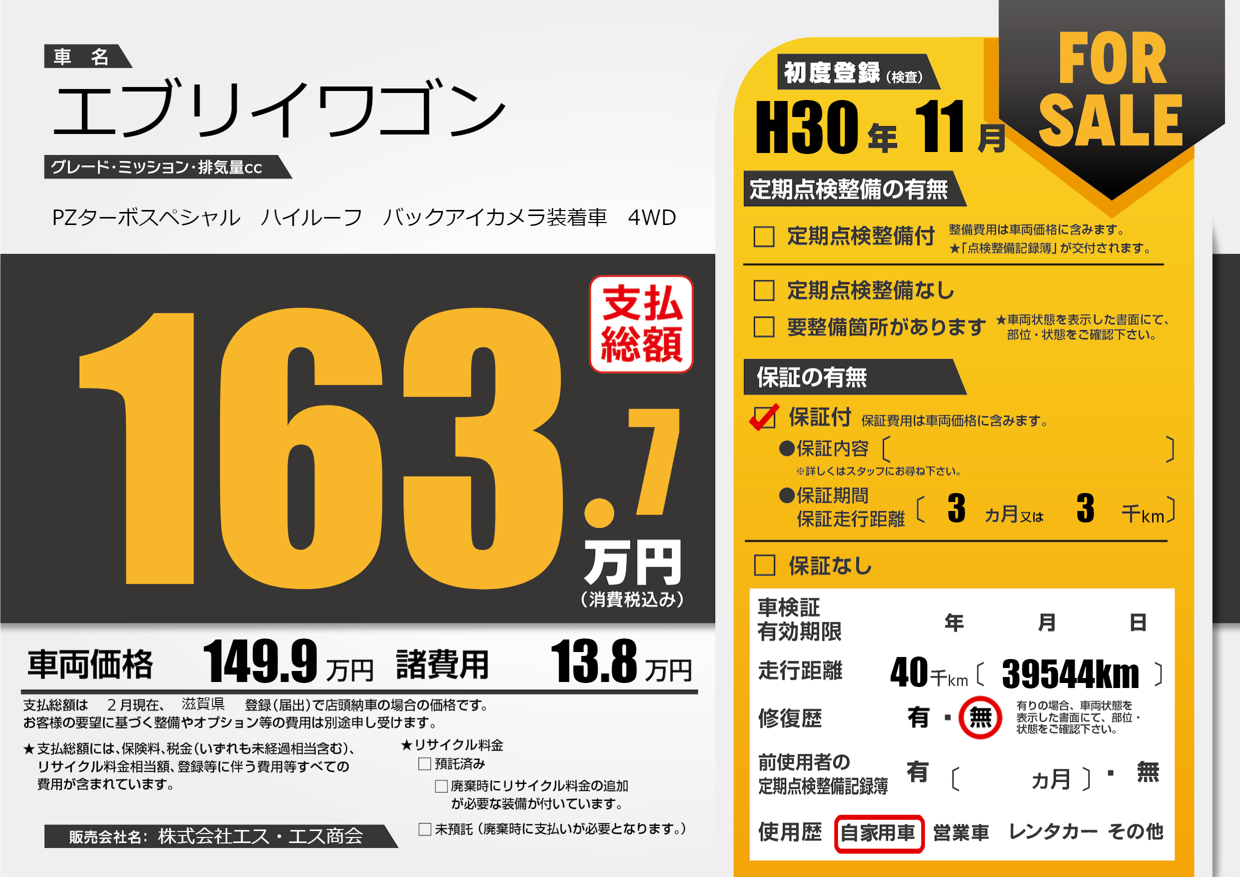 | 車名 | エブリイワゴン | グレード ミッション 排気量 |