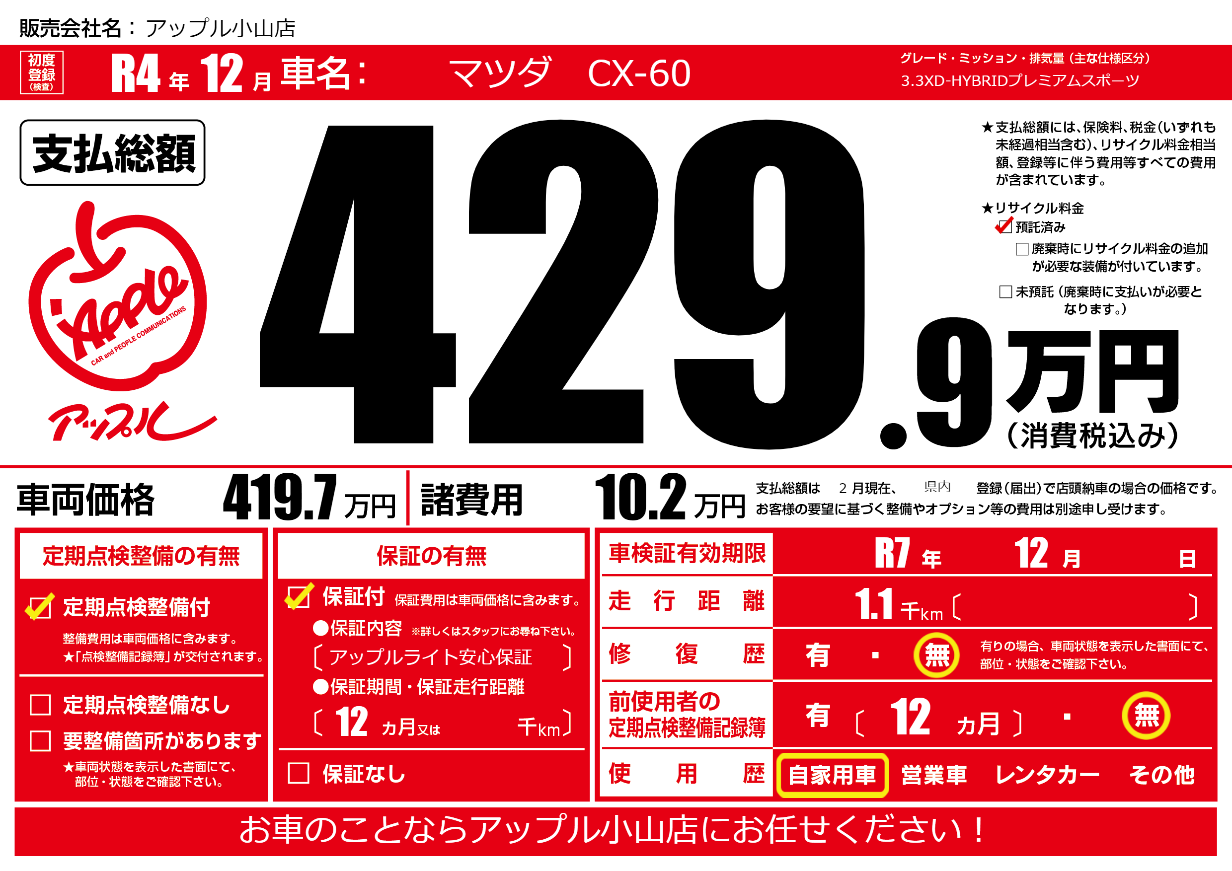 保証付き 保証内容(アップルライト安心保証) 12ヶ月または千km |