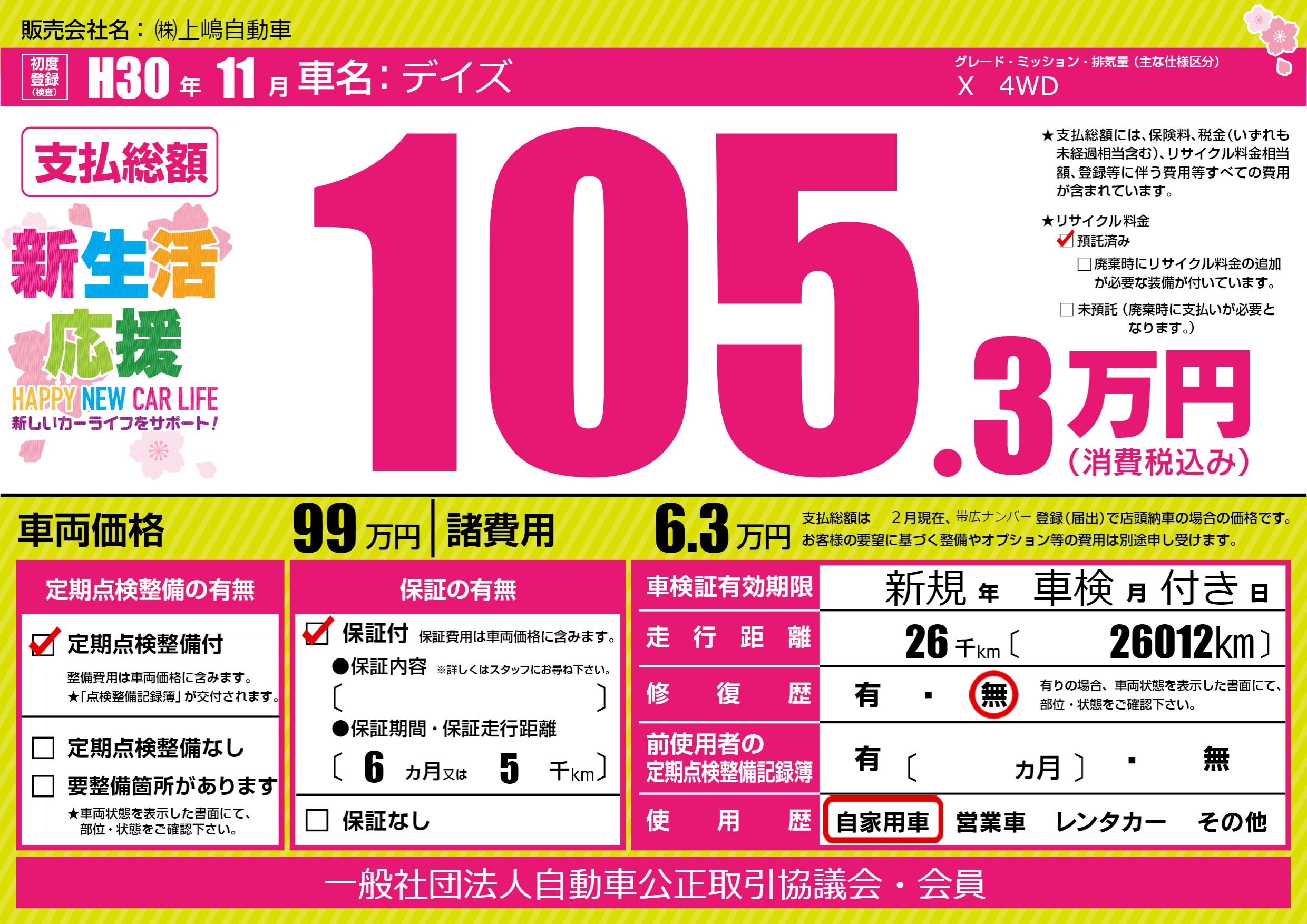 | 車名 | デイズ | グレード ミッション 排気量 |