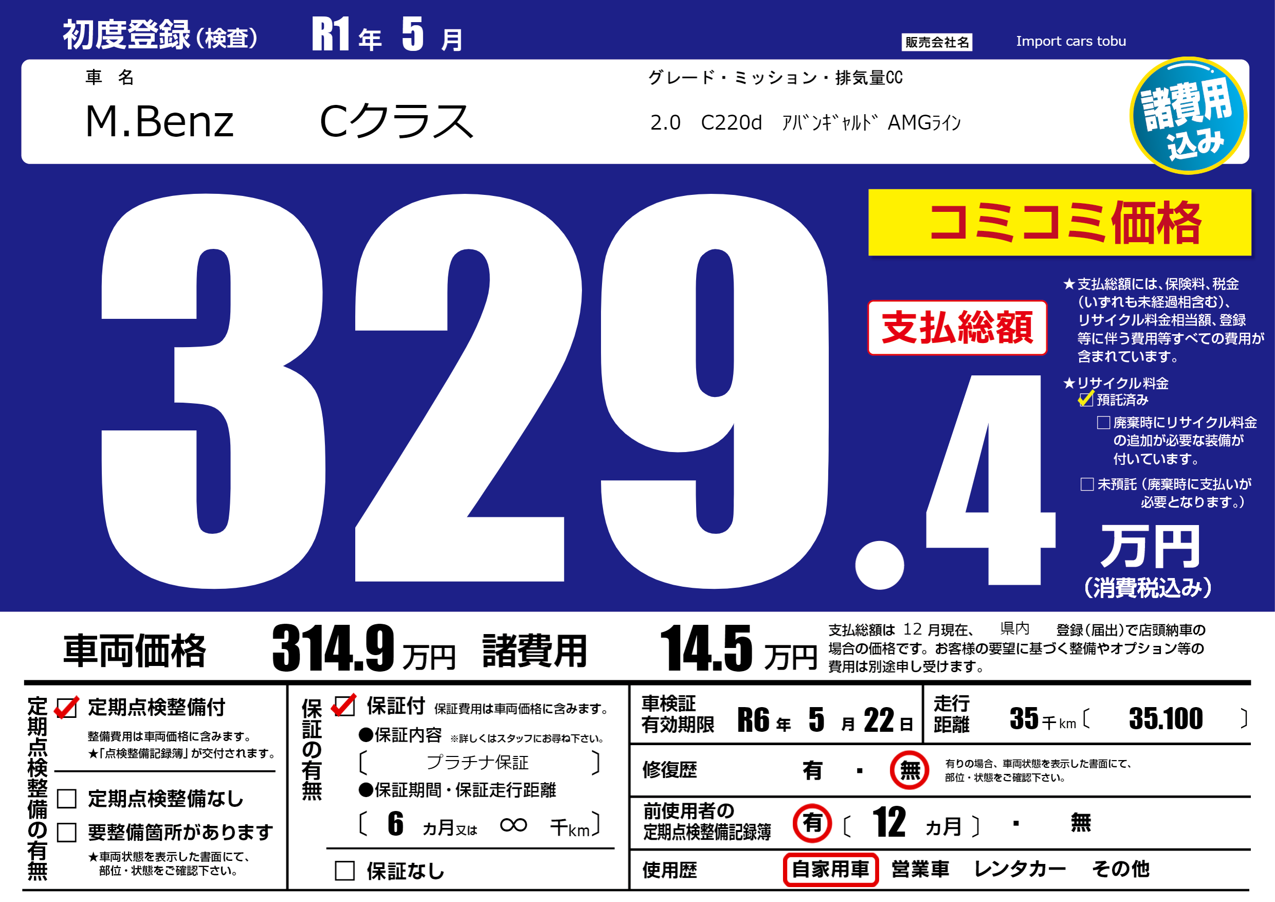 保証付き 保証内容( プラチナ保証) 6ヶ月または(∞)千kmまで |
