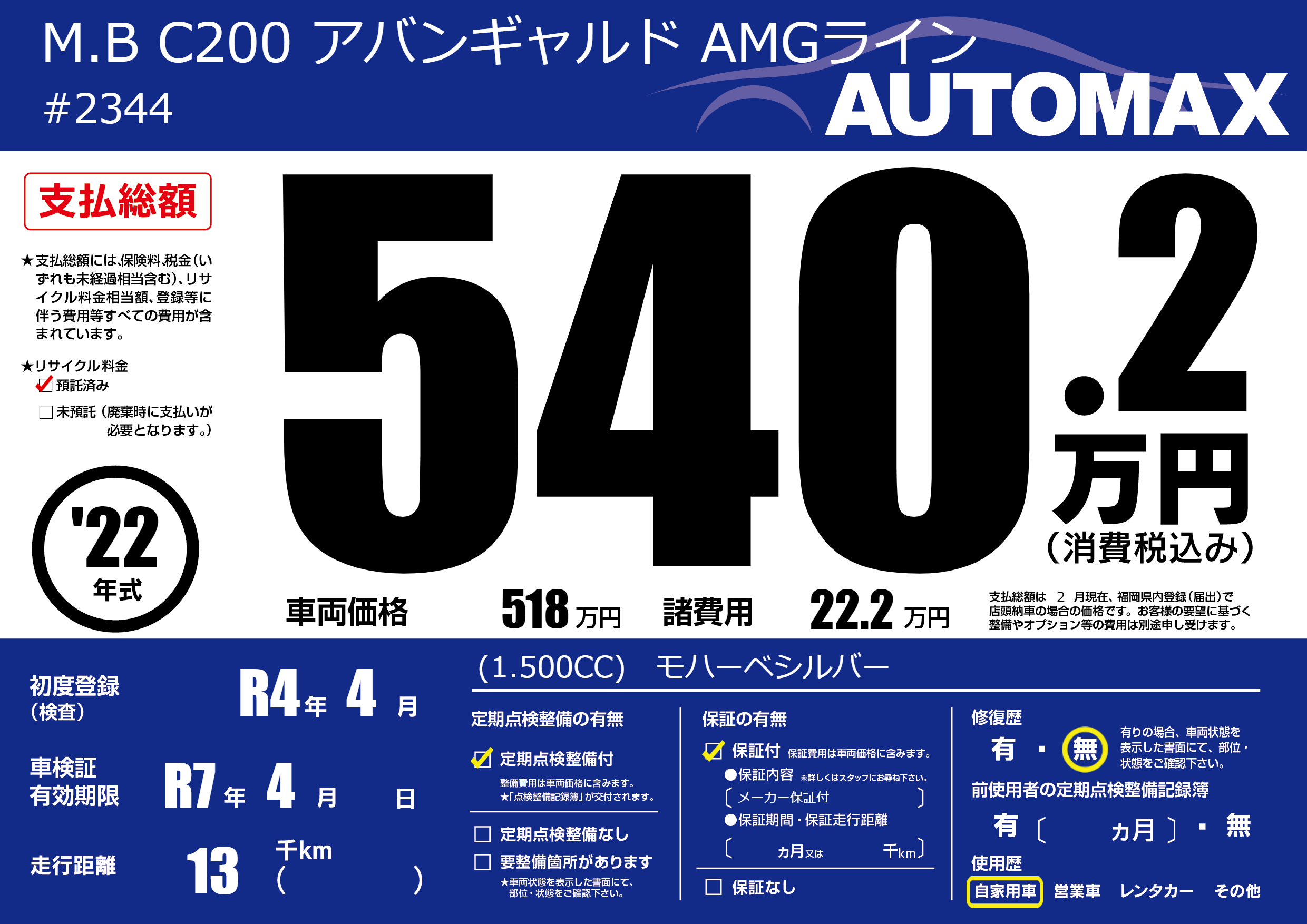 | 車名 | M.B C200 アバンギャルド AMGライン | グレード ミッション 排気量 |