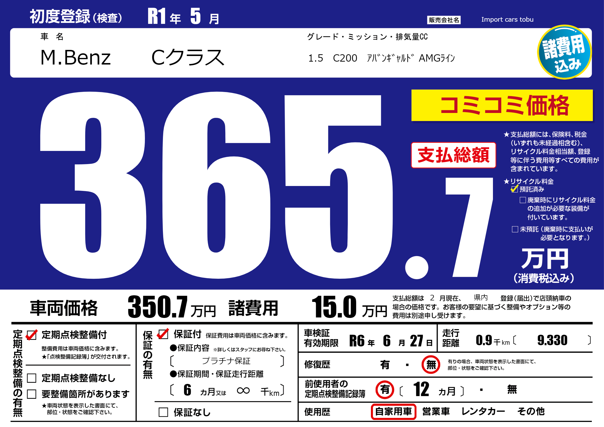 | 車名 | M.Benz Cクラス | グレード ミッション 排気量 |