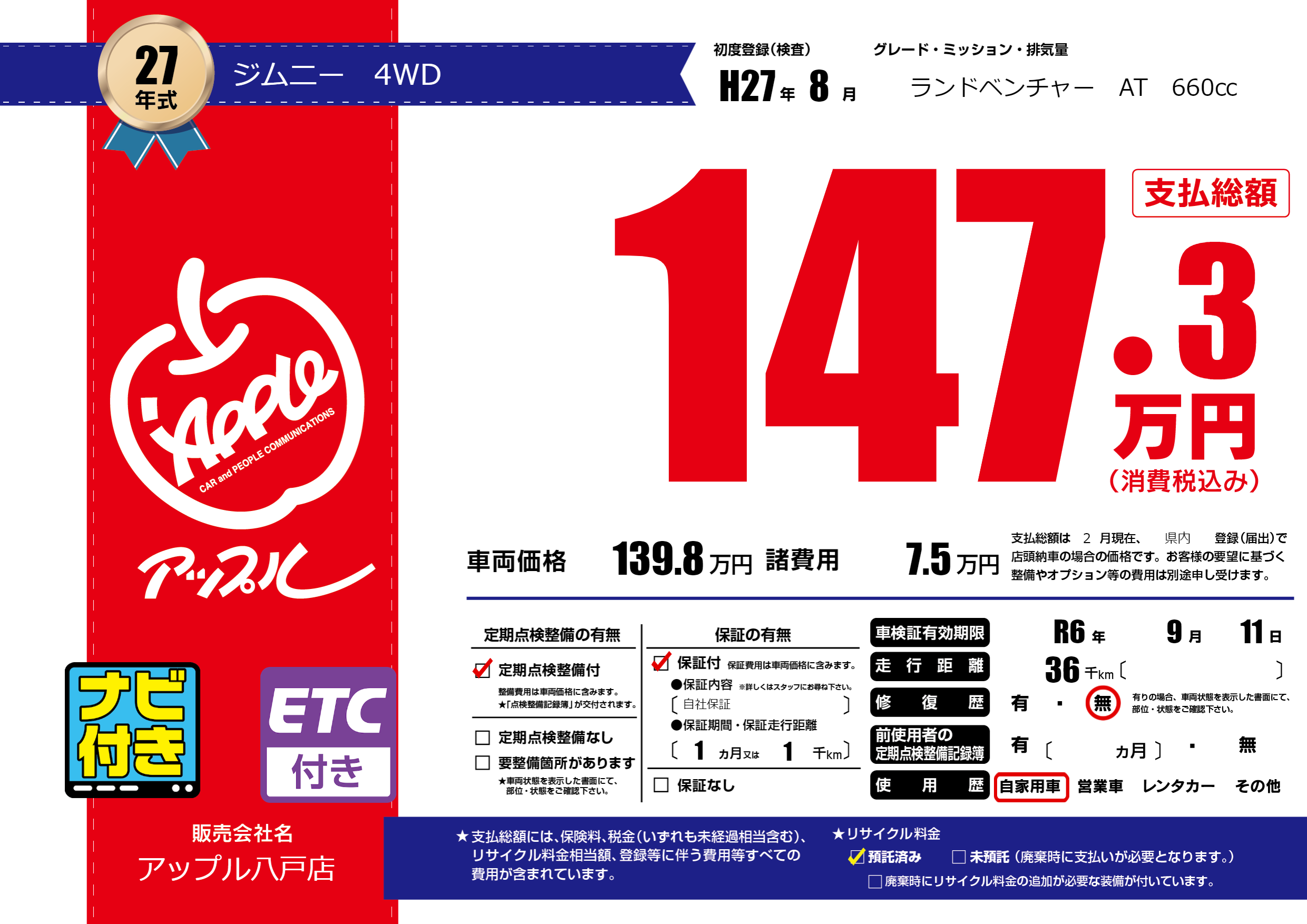 | 車検制限 | R6年 9月 11日 | ||