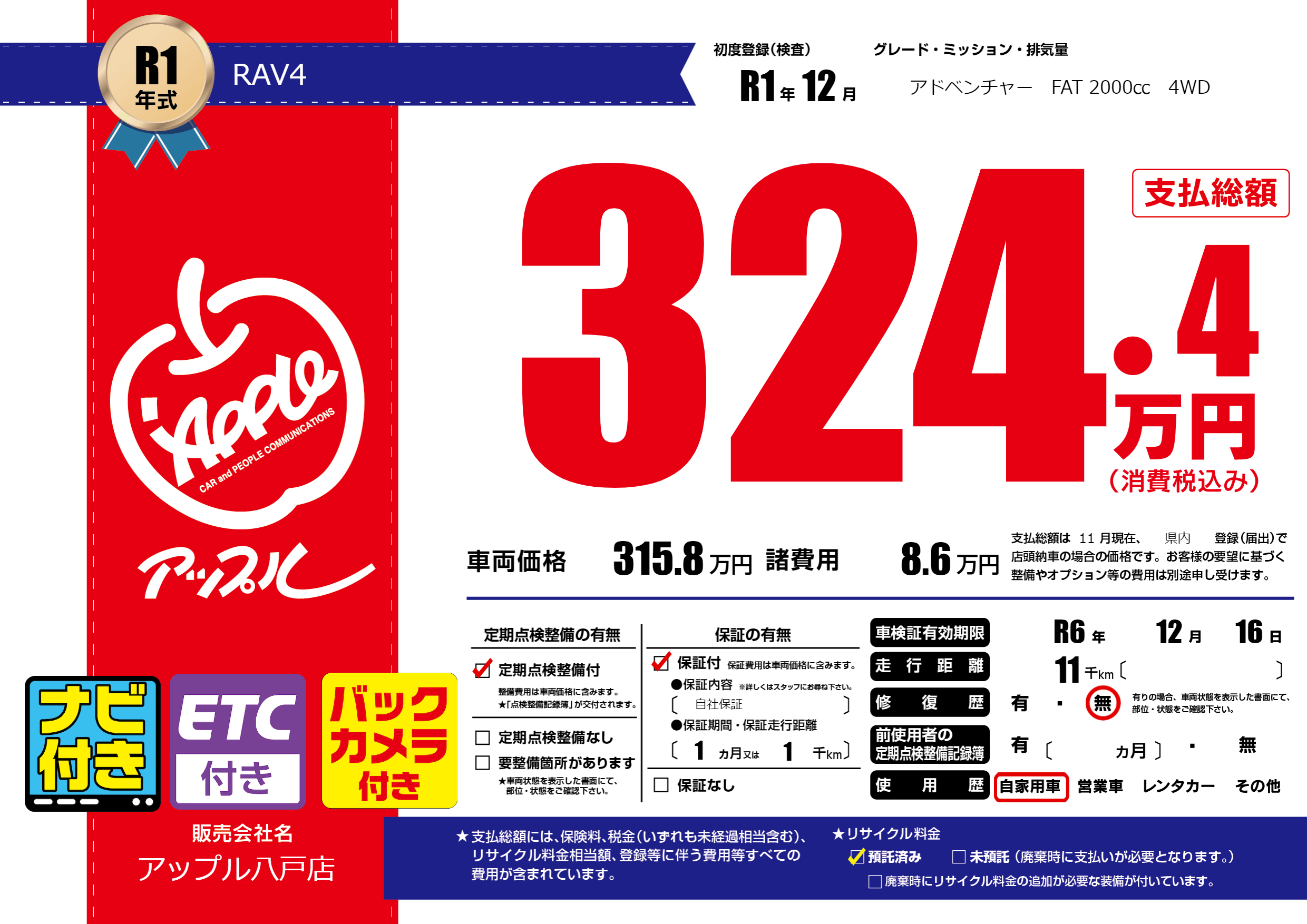 | 車検制限 | R6年 12月 16日 | ||