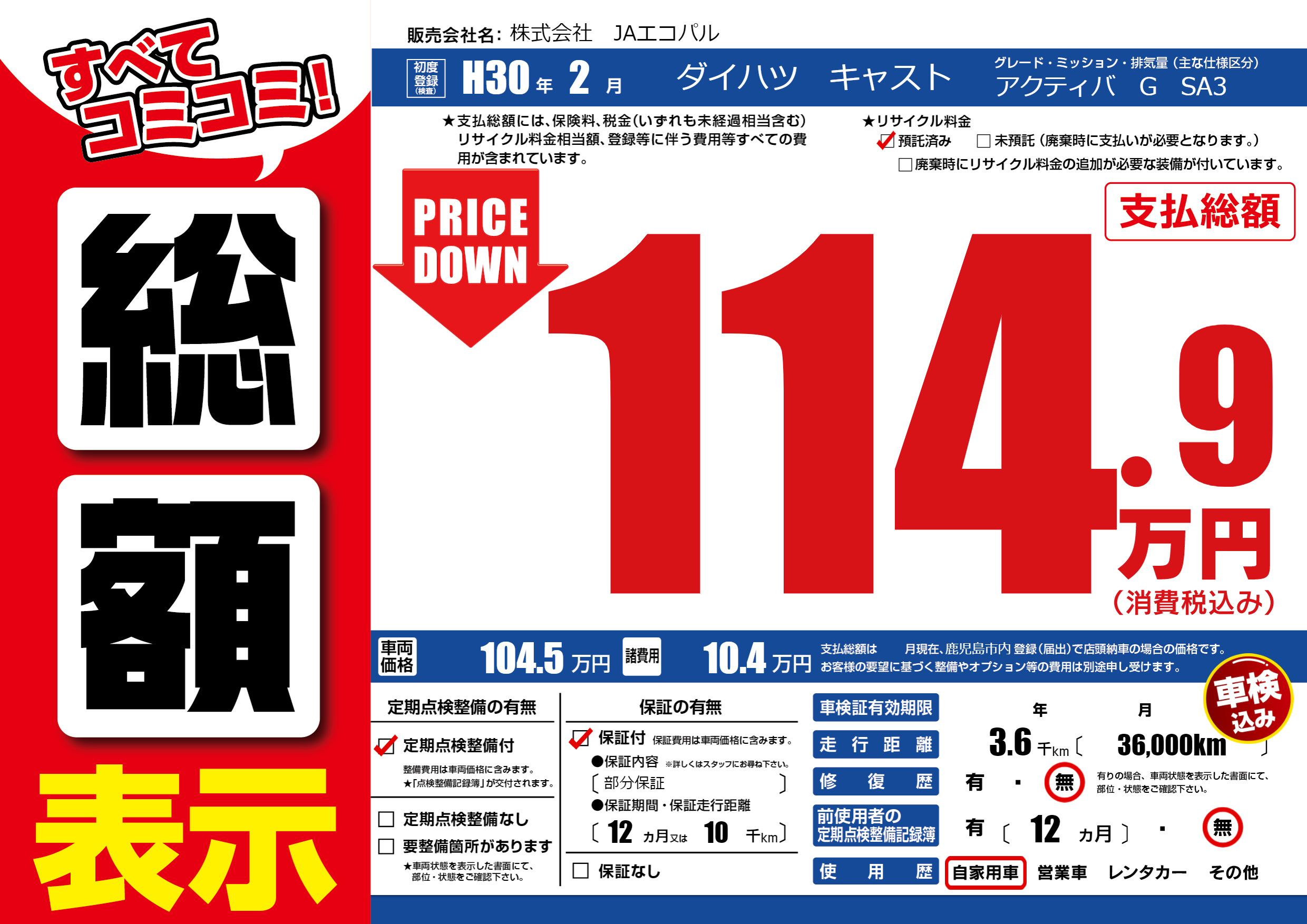 | 走行キロ | 0.3万km | 初年度登録 | H30年2月 |
