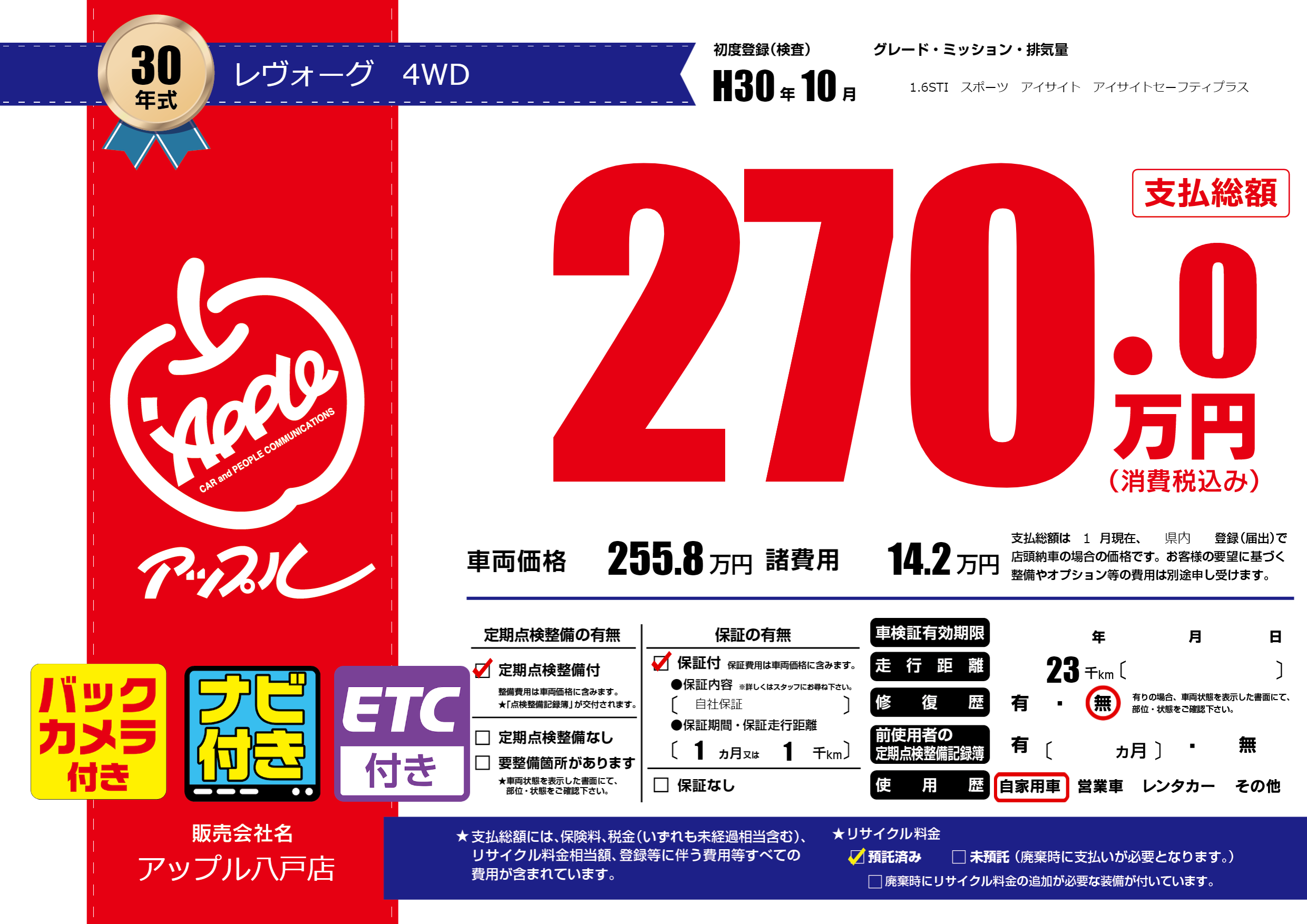 | 車名 | レヴォーグ 4WD | グレード ミッション 排気量 |