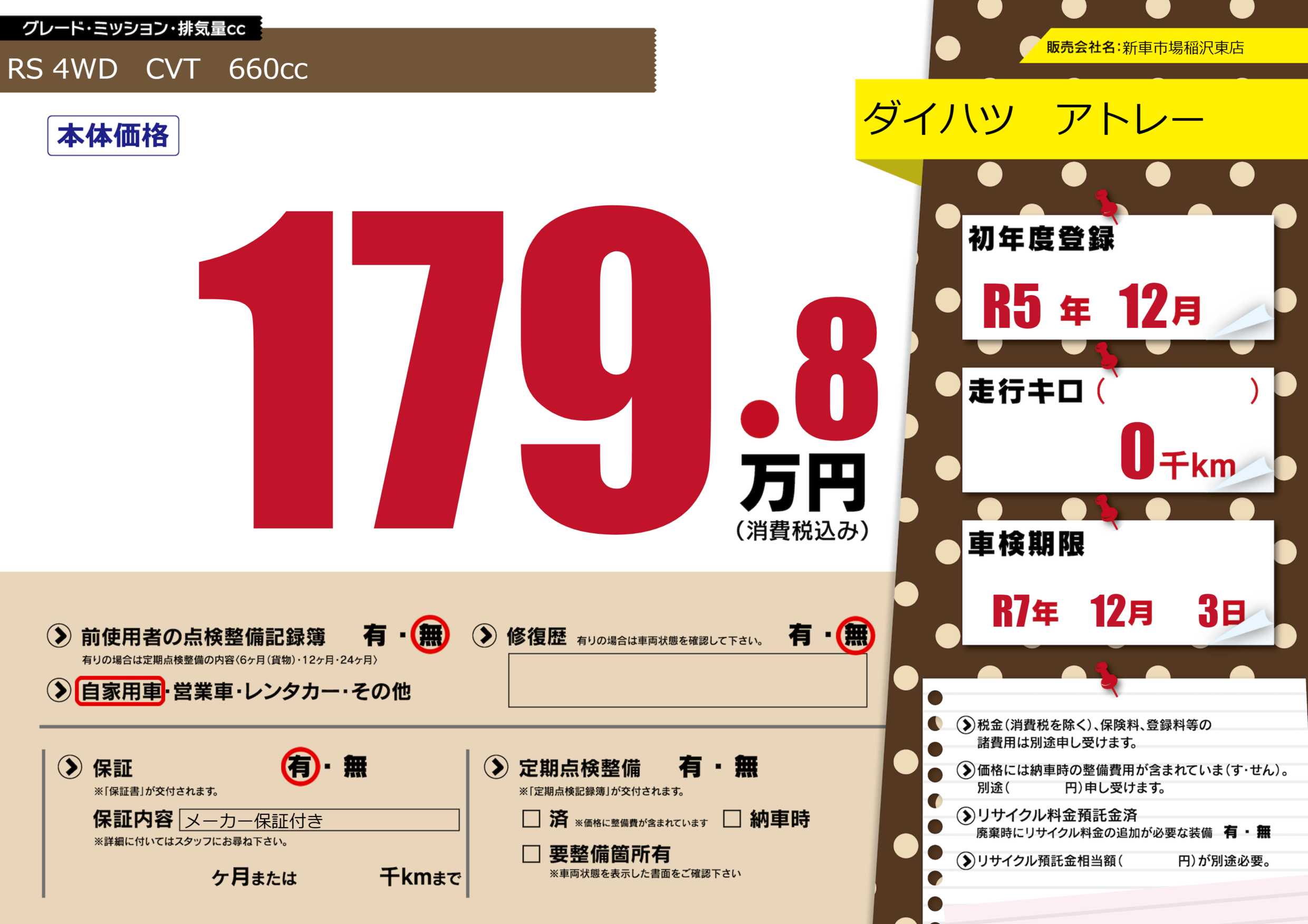 保証付き 保証内容(メーカー保証付き) ---ヶ月または()千kmまで |