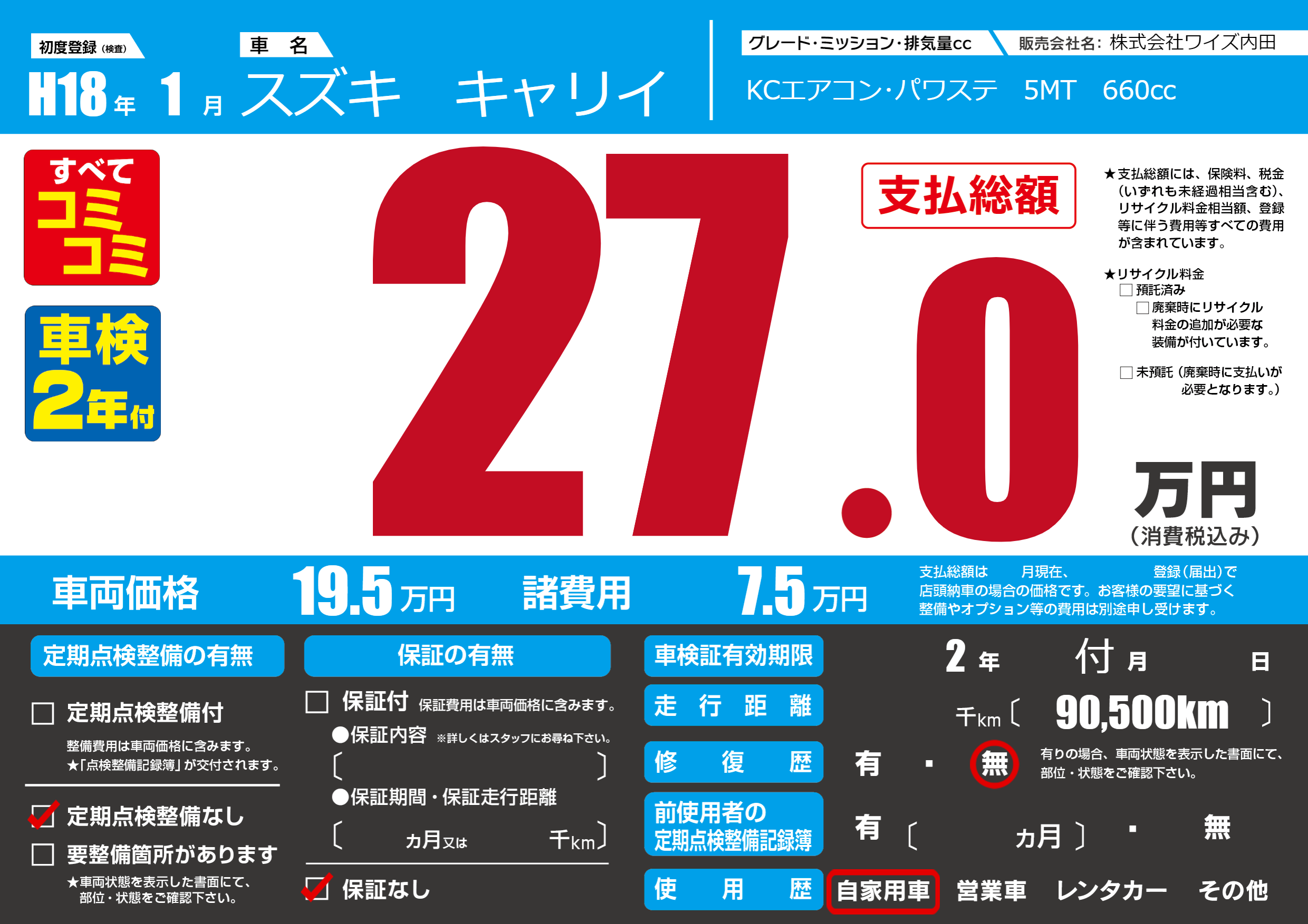 | 車名 | スズキ キャリイ | グレード ミッション 排気量 |