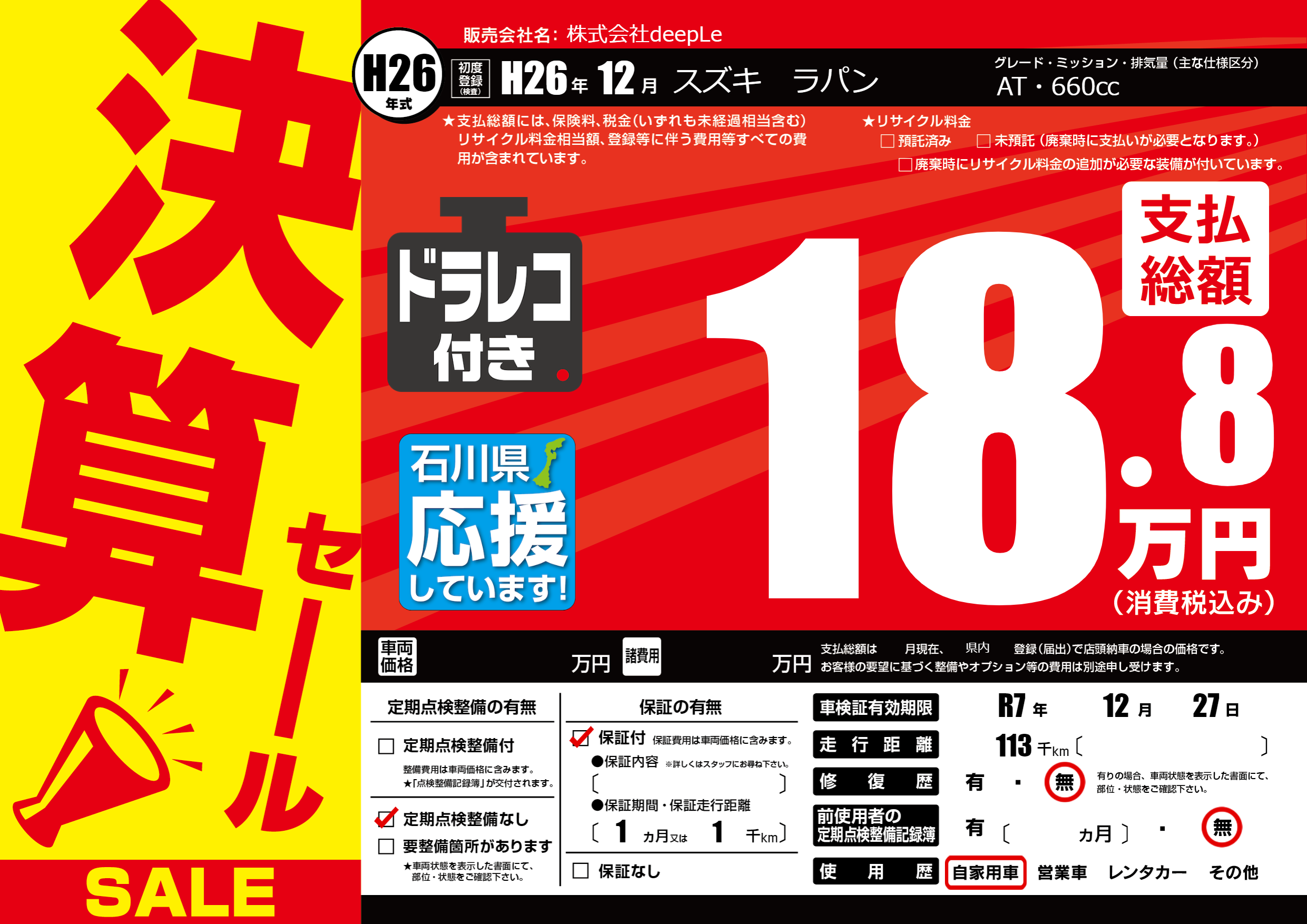 | 走行キロ | 11.3万km | 初年度登録 | H26年12月 |
