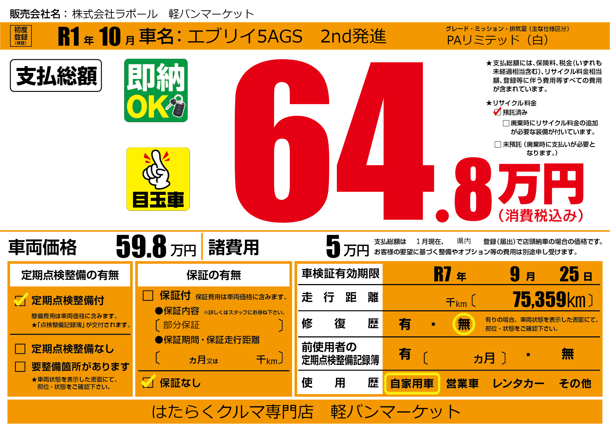 | 車検制限 | R7年 9月 25日 | ||