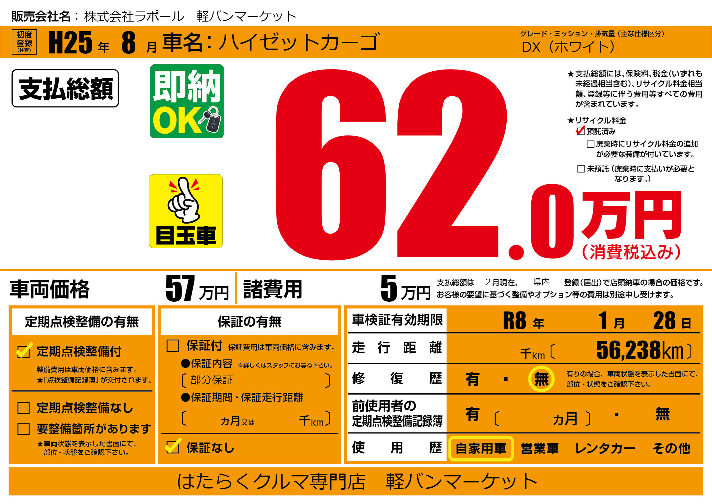 | 車名 | ハイゼットカーゴ | グレード ミッション 排気量 |