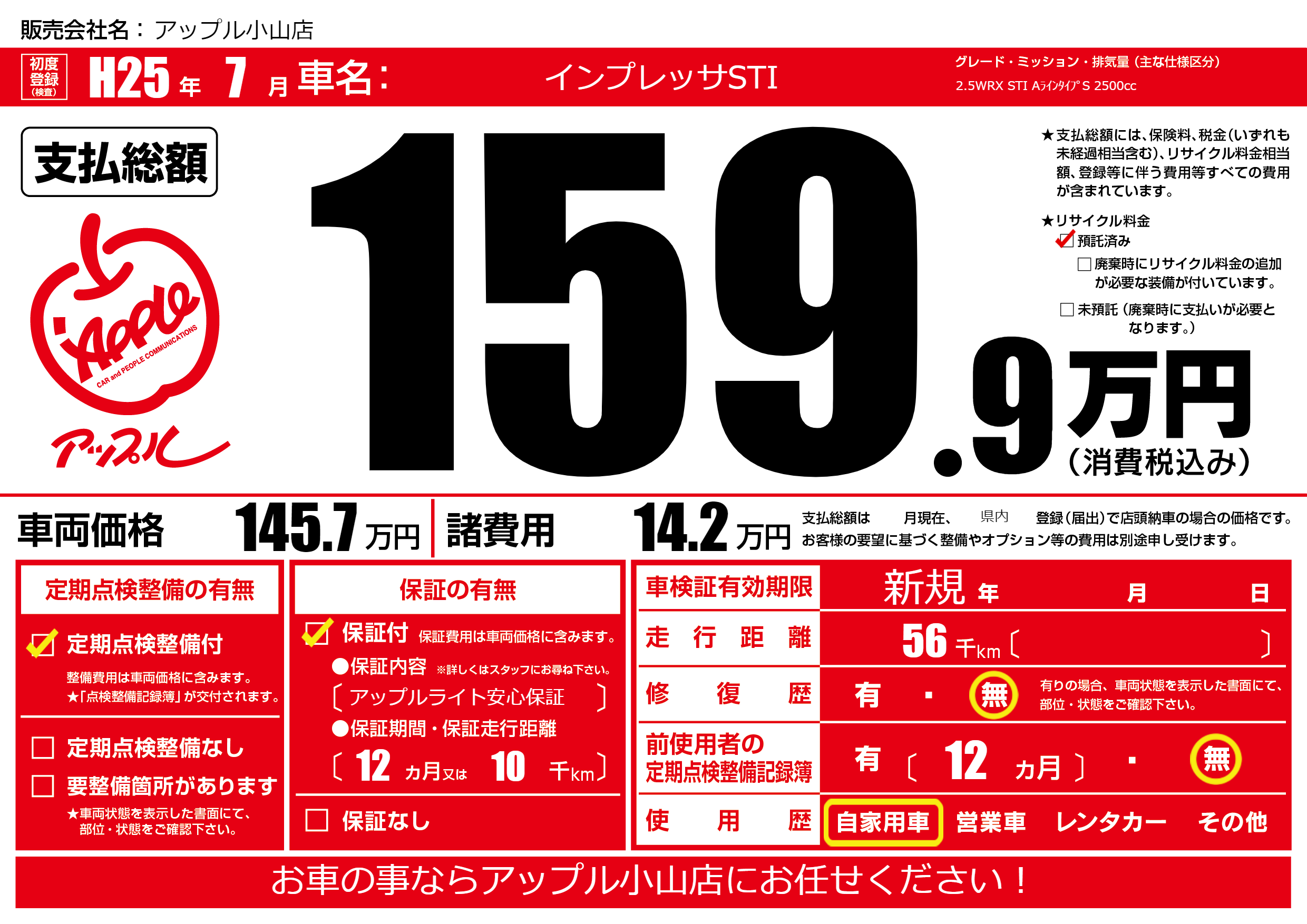 | 車名 | インプレッサSTI | グレード ミッション 排気量 |