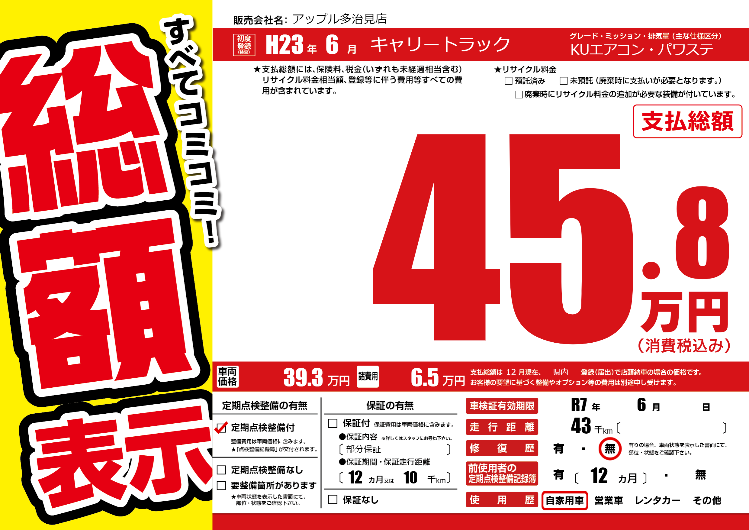 | 車名 | キャリートラック | グレード ミッション 排気量 |