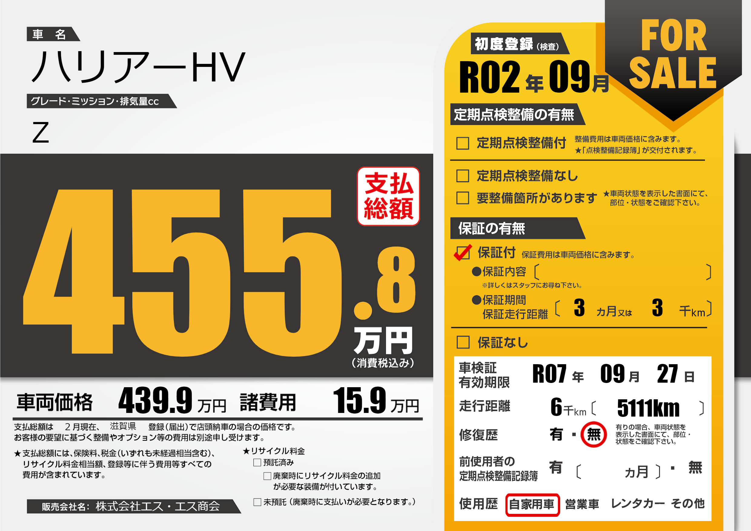 | 走行キロ | 0.6万km | 初年度登録 | R02年09月 |