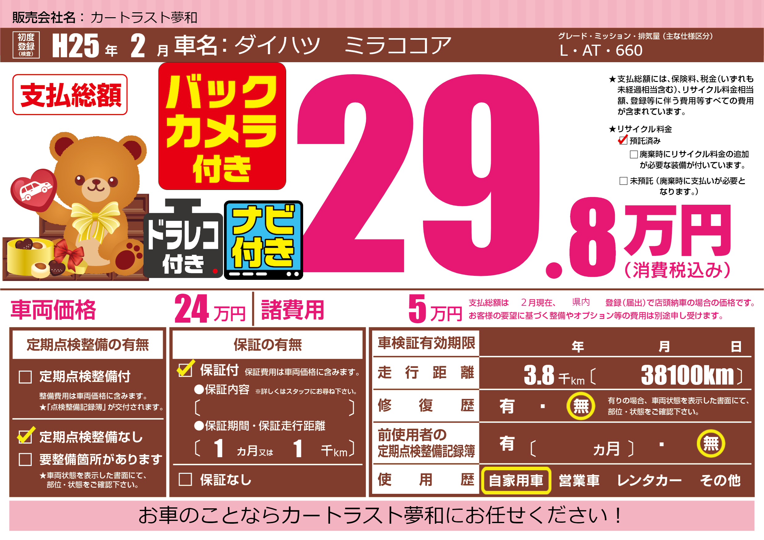| 走行キロ | 0.3万km | 初年度登録 | H25年2月 |