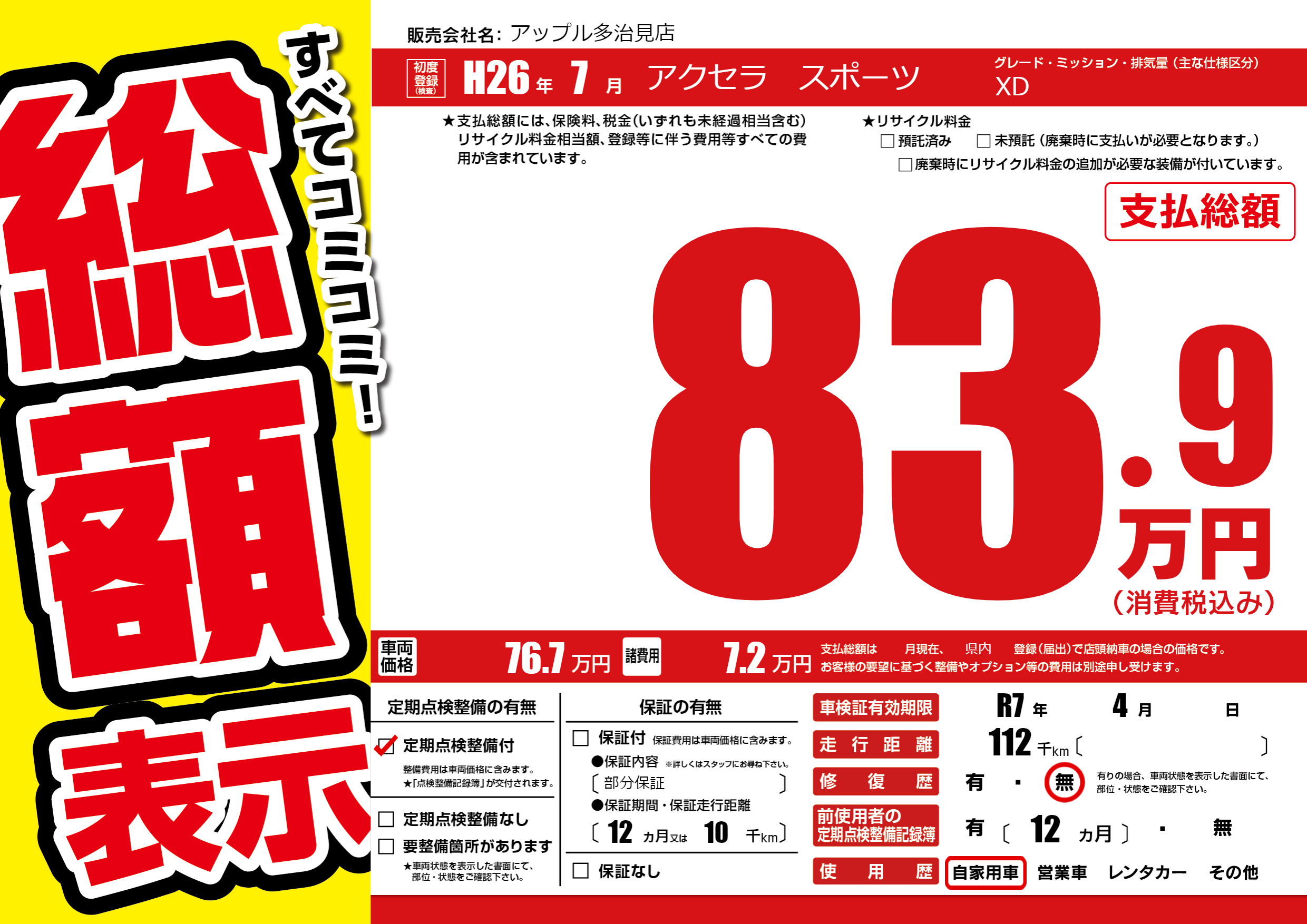 | 走行キロ | 11.2万km | 初年度登録 | H26年7月 |