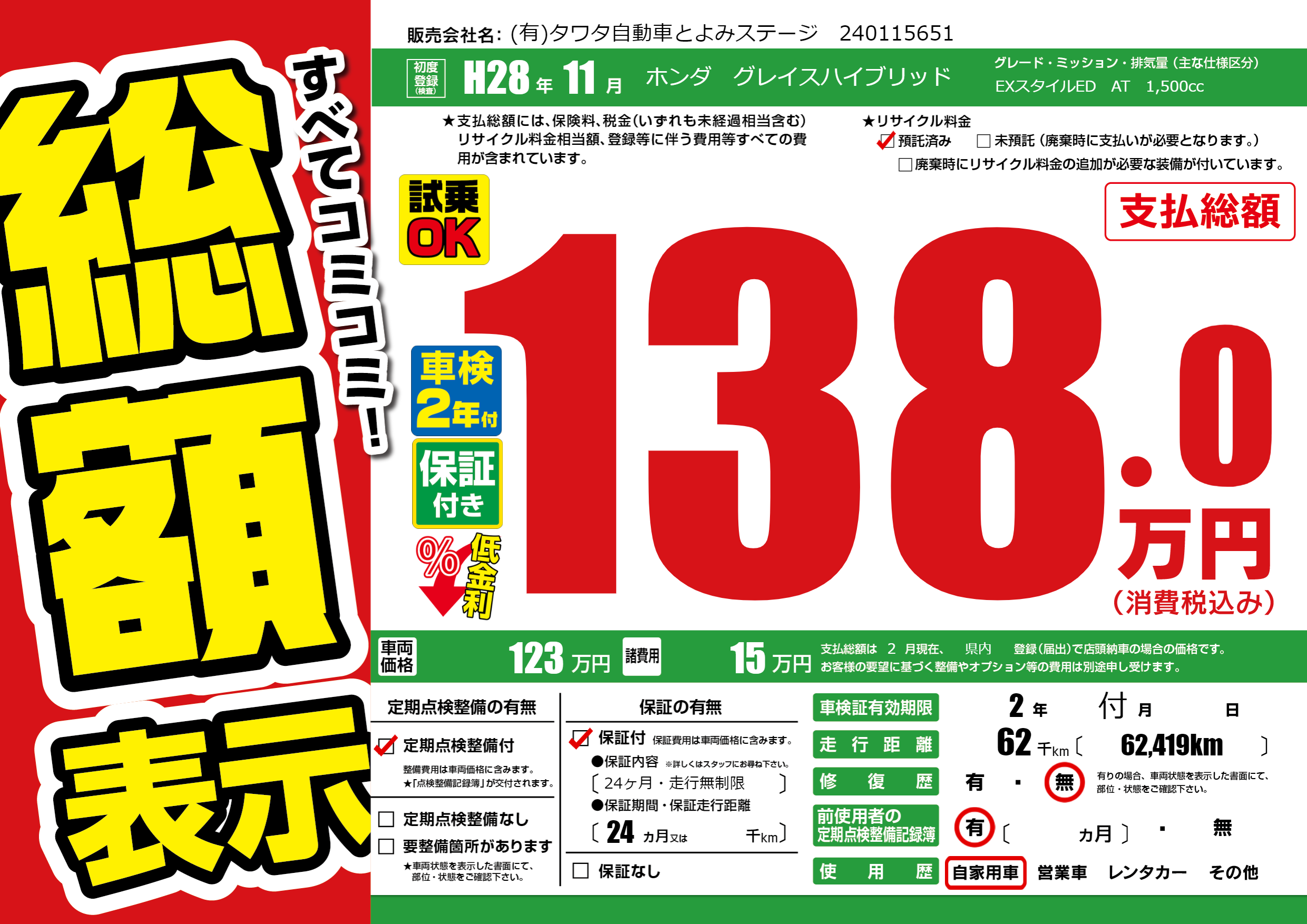 | 車名 | ホンダ グレイスハイブリッド | グレード ミッション 排気量 |