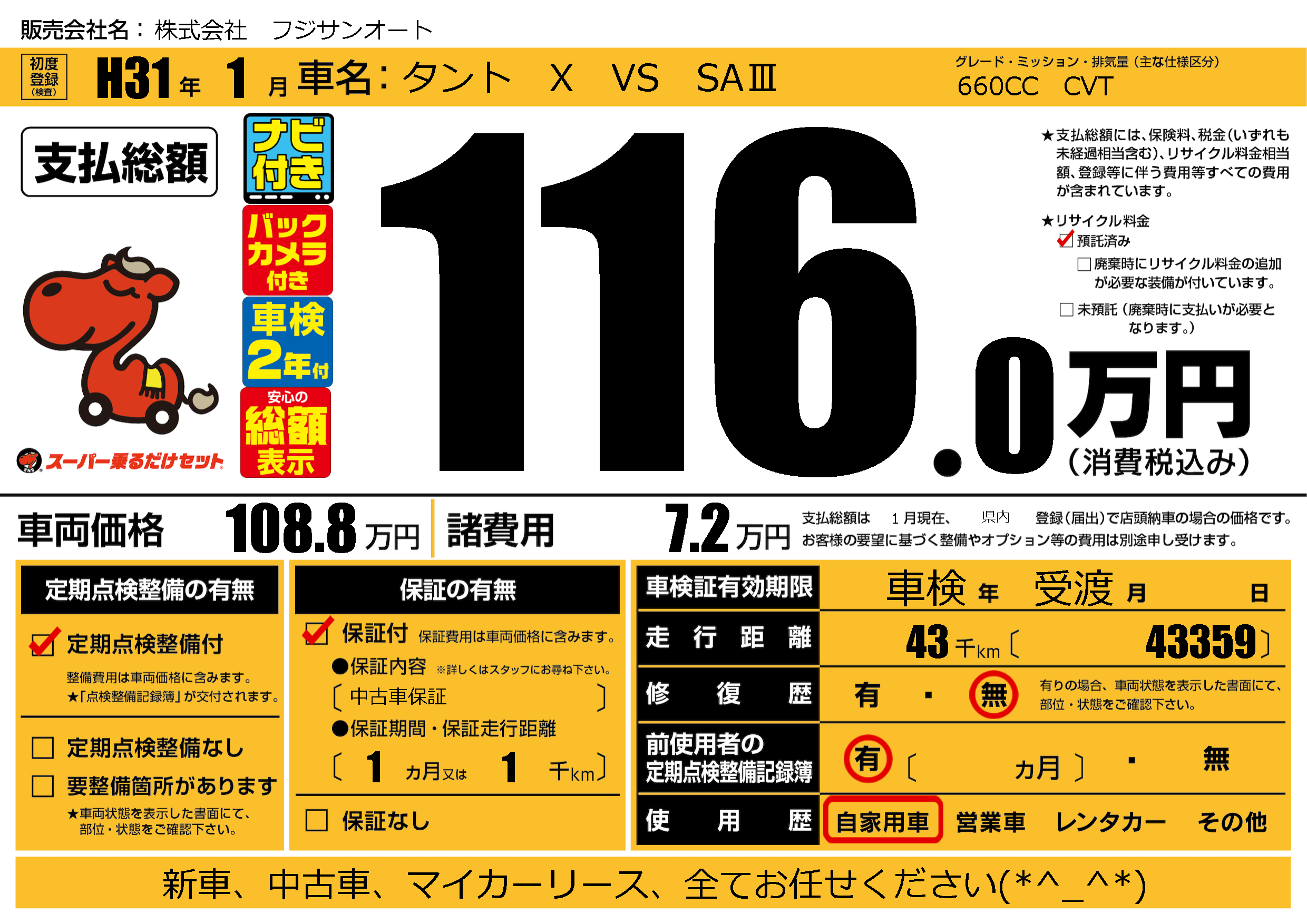| 車名 | タント X VS SAⅢ | グレード ミッション 排気量 |