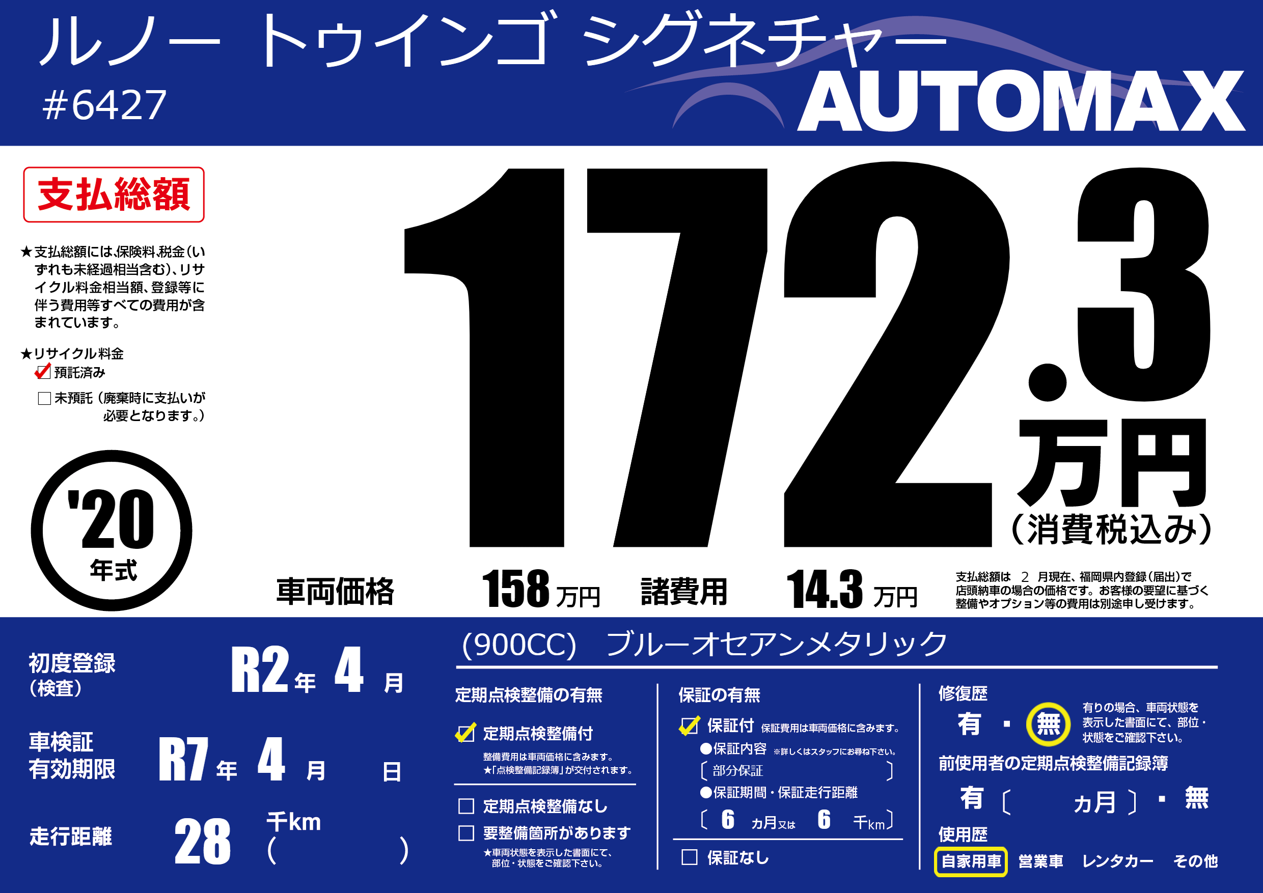 | 車名 | ルノー トゥインゴ シグネチャー | グレード ミッション 排気量 |