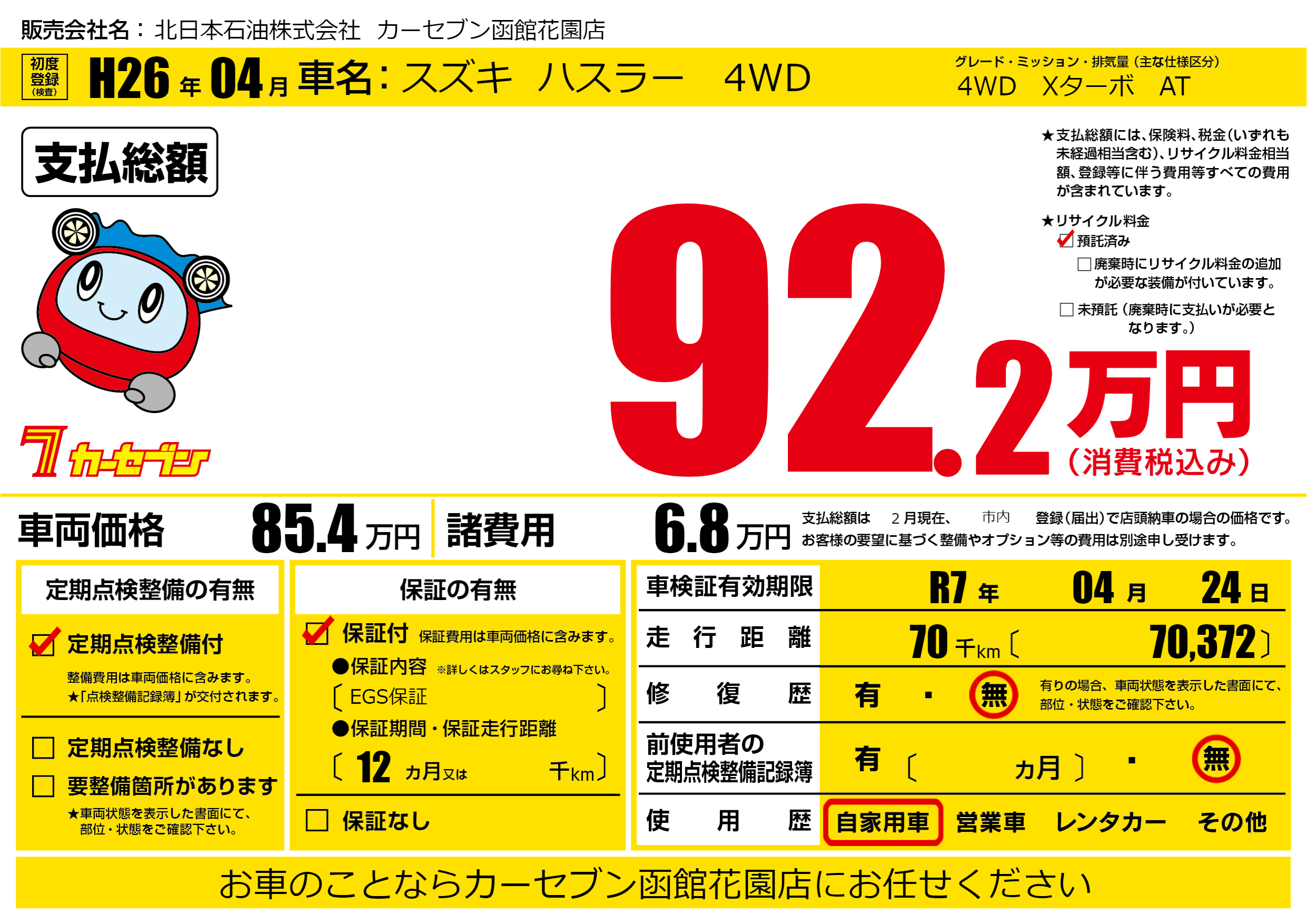 | 車名 | スズキ ハスラー 4WD | グレード ミッション 排気量 |