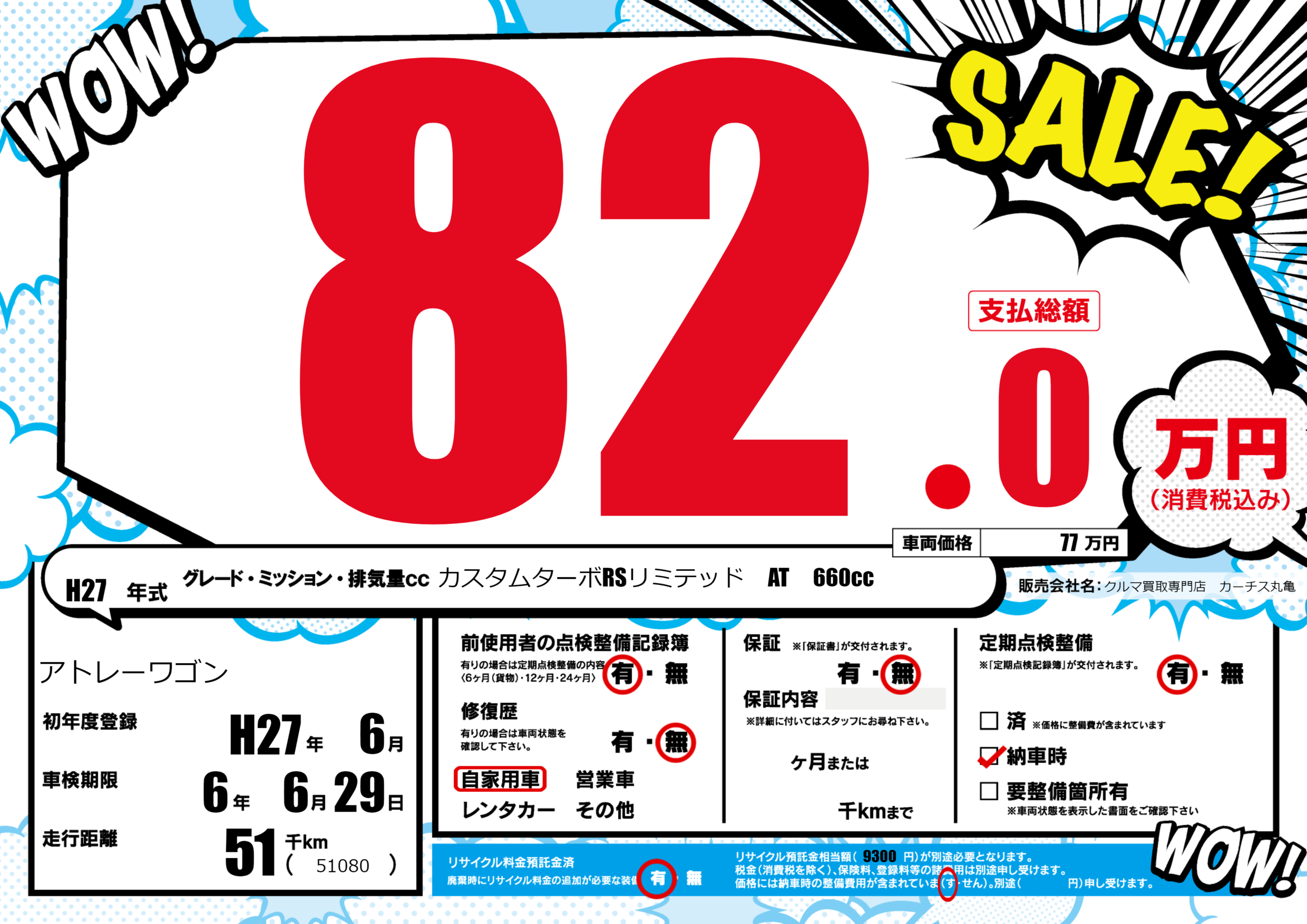 | 走行キロ | 5.1万km | 初年度登録 | H27年6月 |