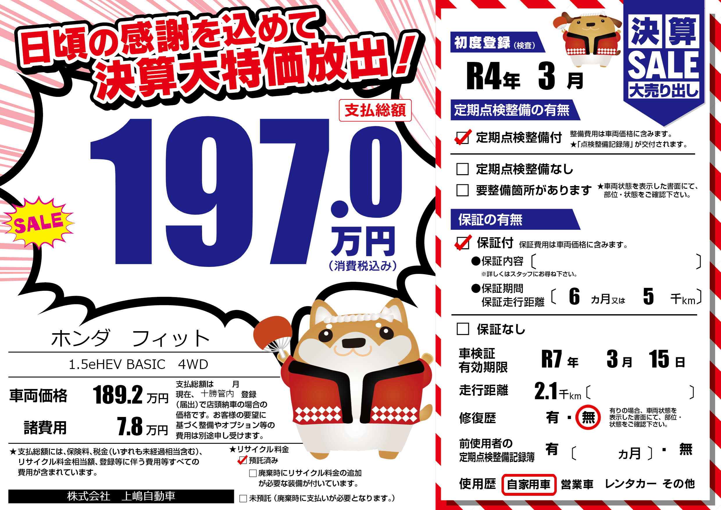| 車検制限 | R7年 3月 15日 | ||