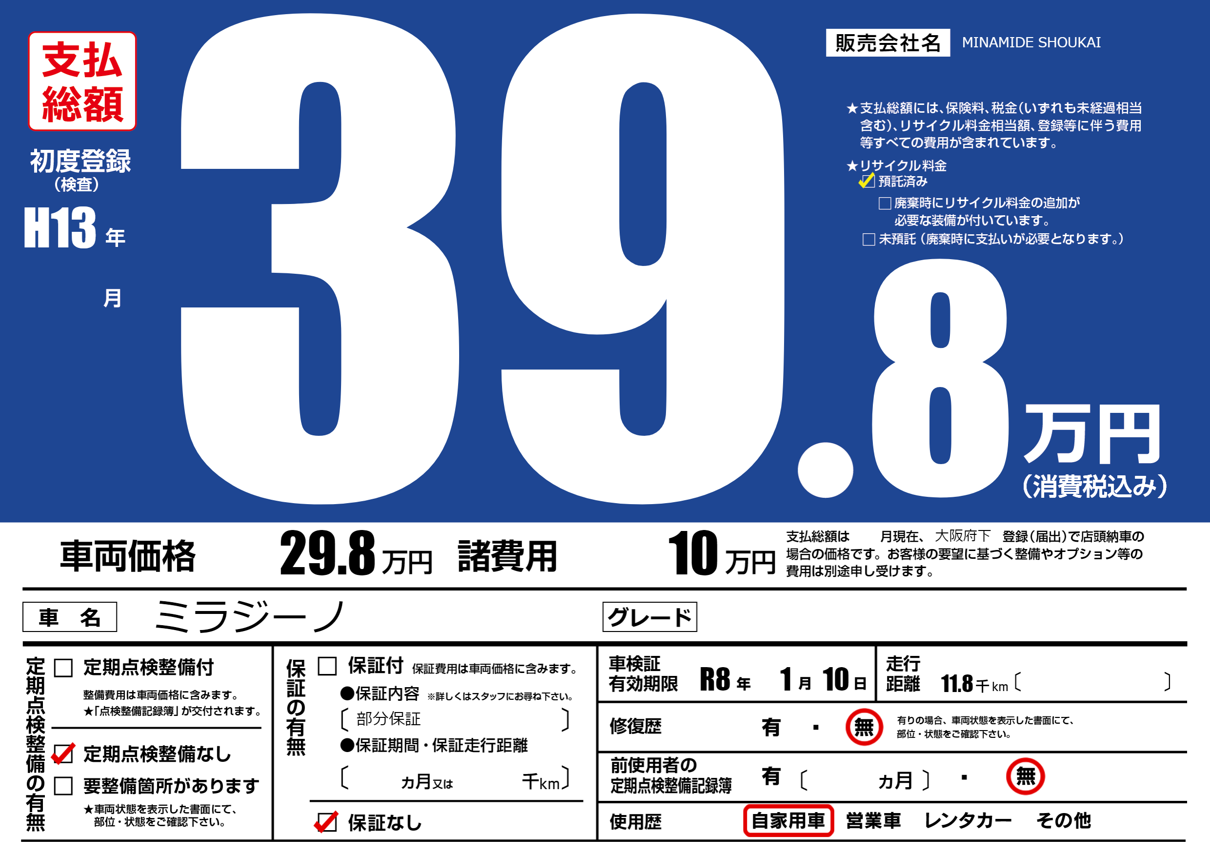 | 車名 | ミラジーノ | グレード ミッション 排気量 |