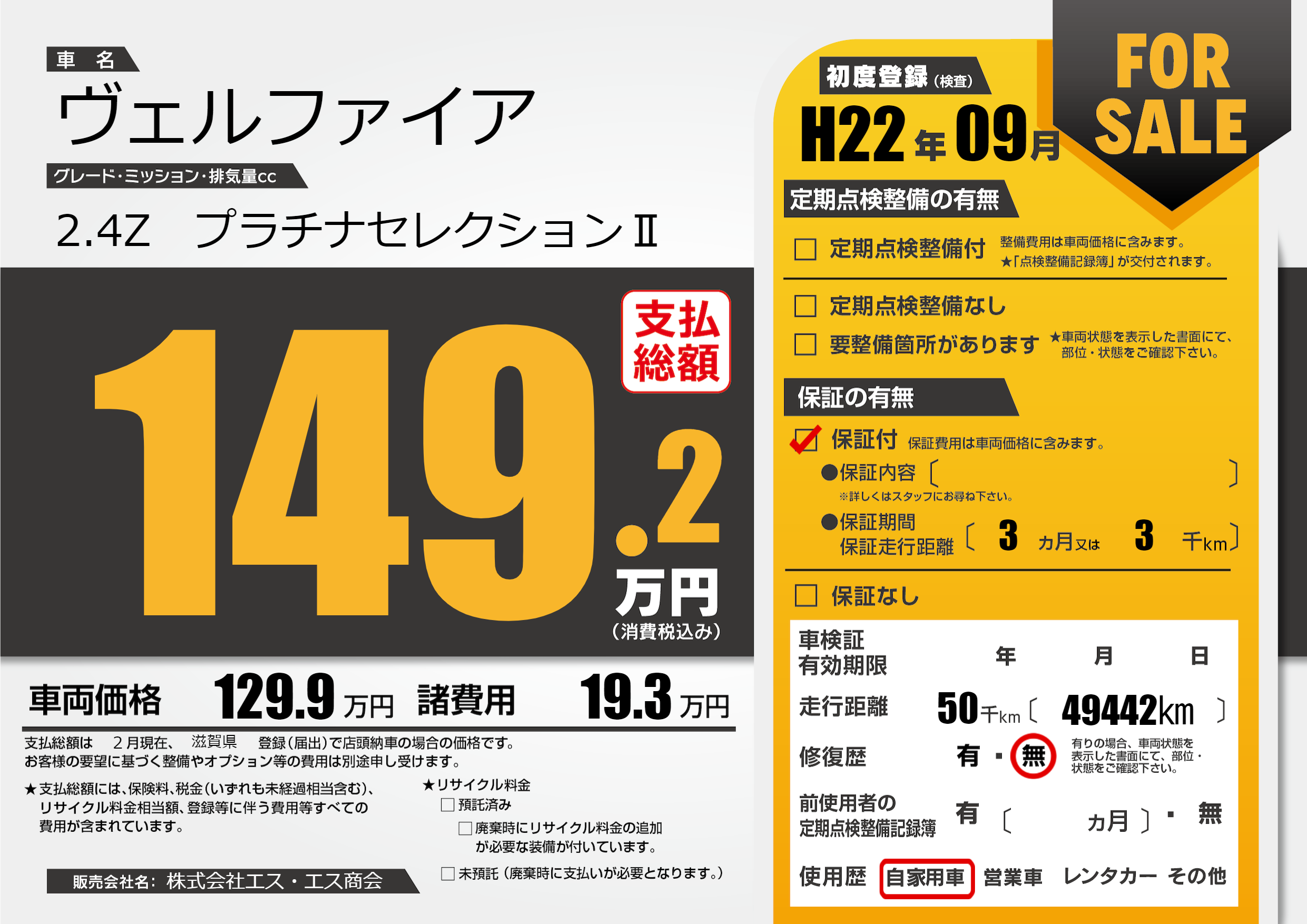 | 走行キロ | 5万km | 初年度登録 | H22年09月 |