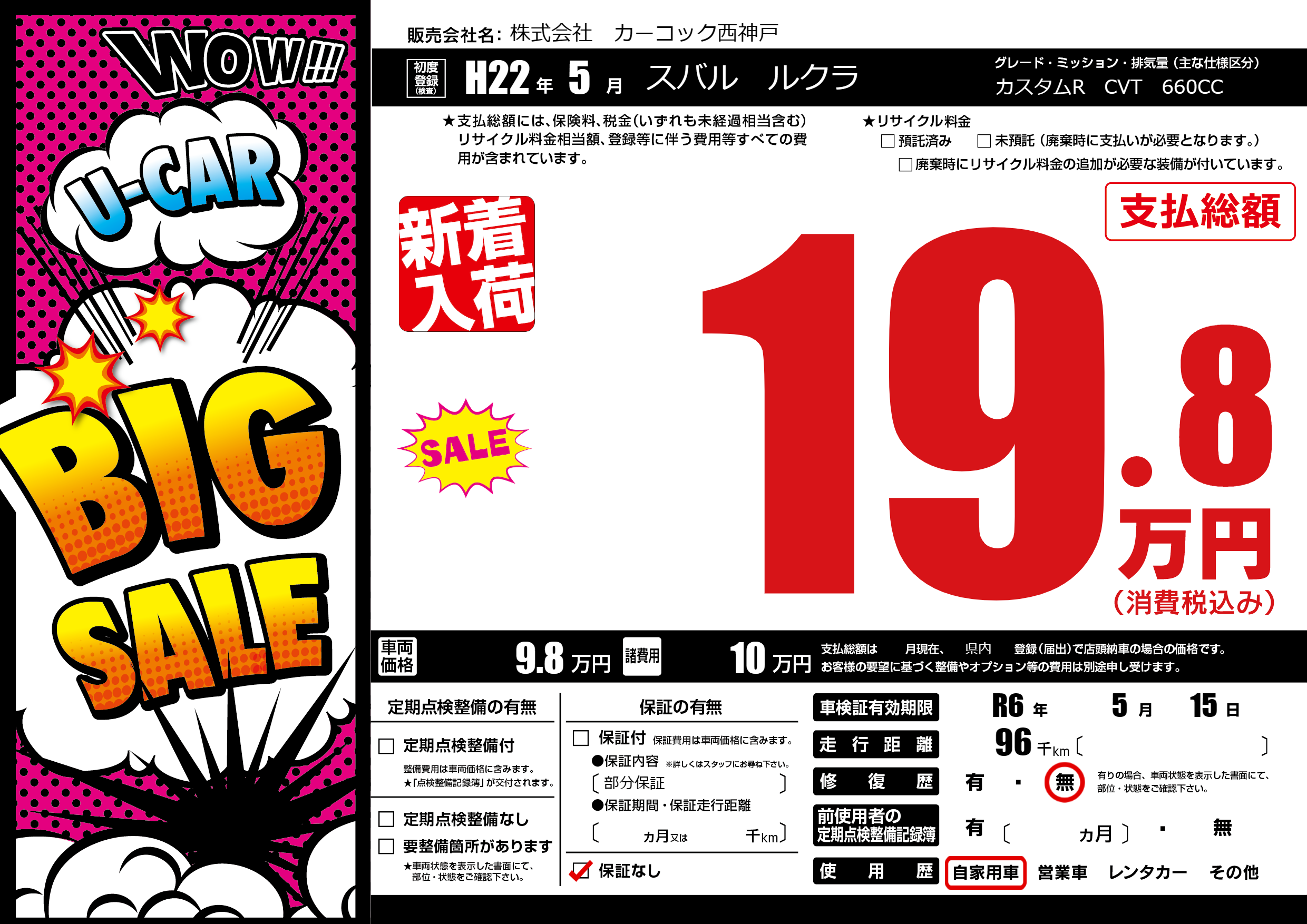 | 走行キロ | 9.6万km | 初年度登録 | H22年5月 |