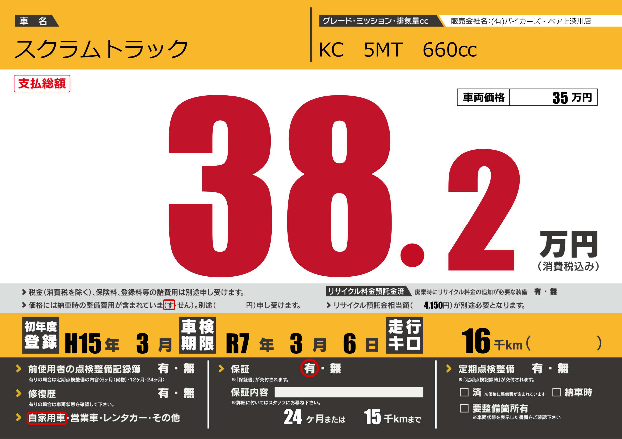 保証なし 保証内容(---) 24ヶ月または(15)千kmまで |