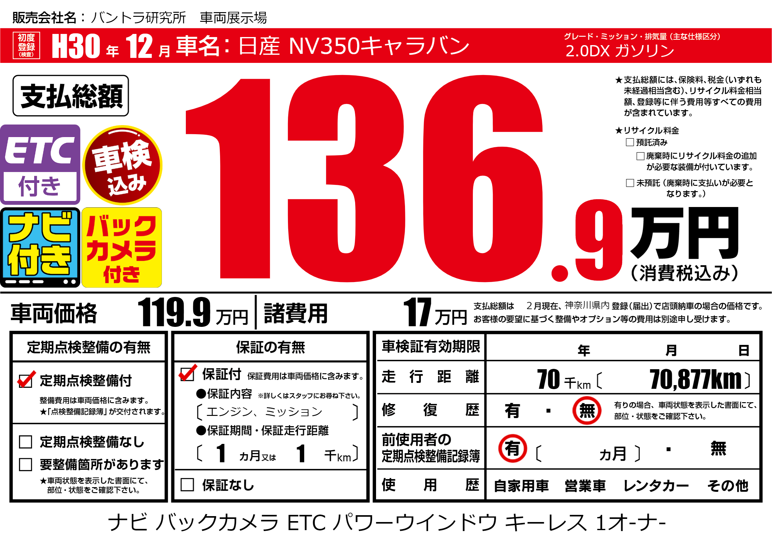 | 走行キロ | 7万km | 初年度登録 | H30年12月 |
