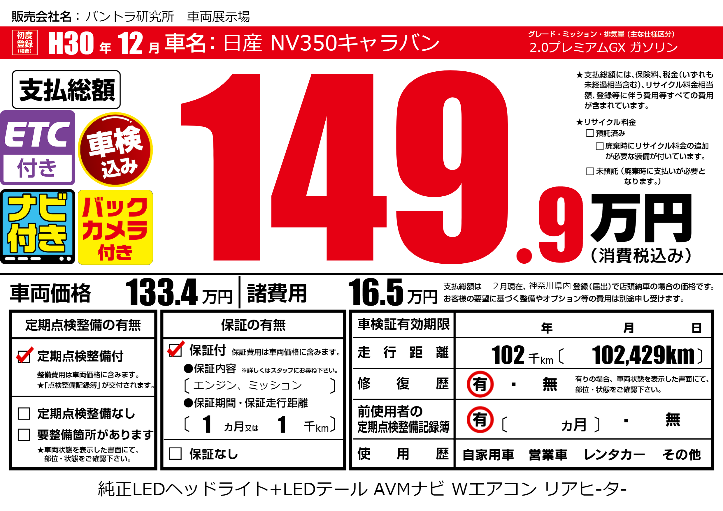 | 車名 | 日産 NV350キャラバン | グレード ミッション 排気量 |