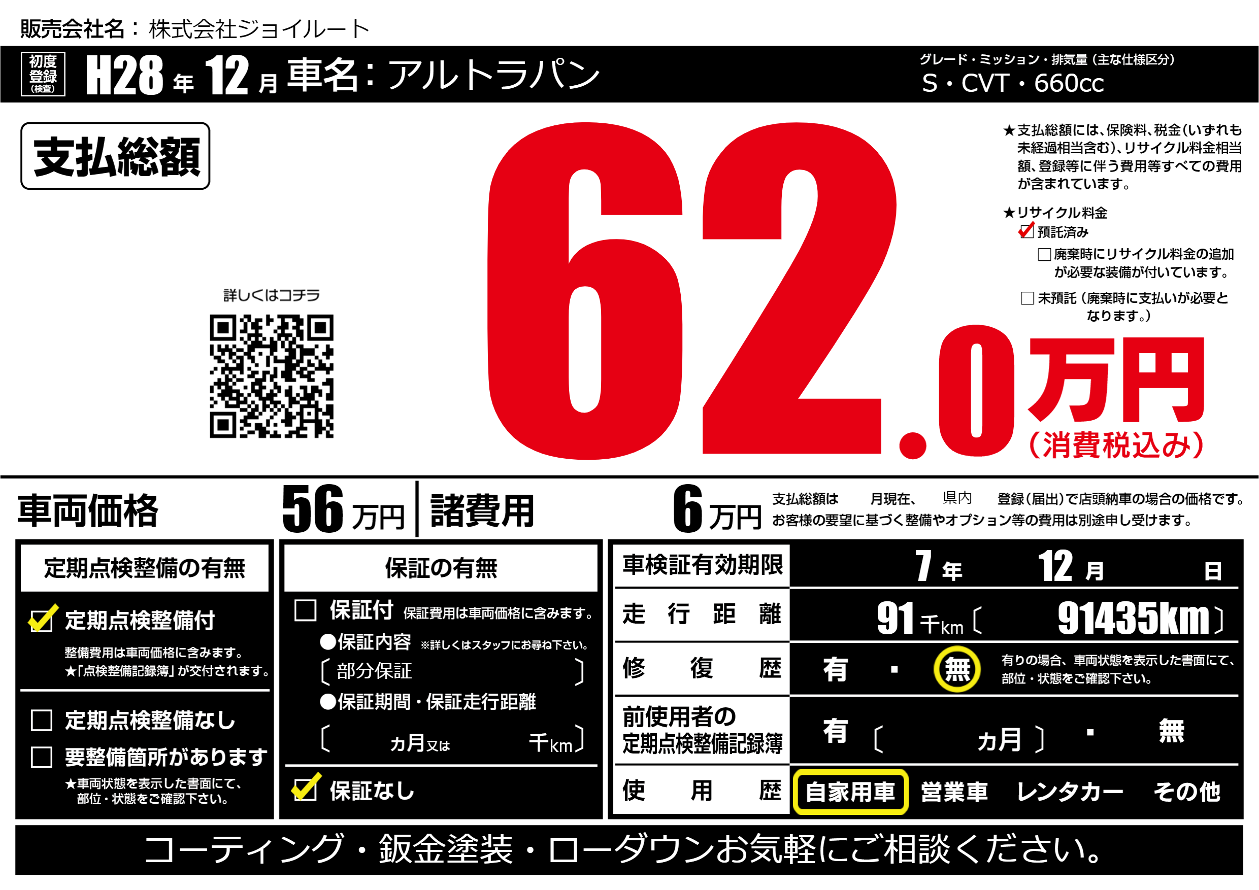 | 走行キロ | 9.1万km | 初年度登録 | H28年12月 |