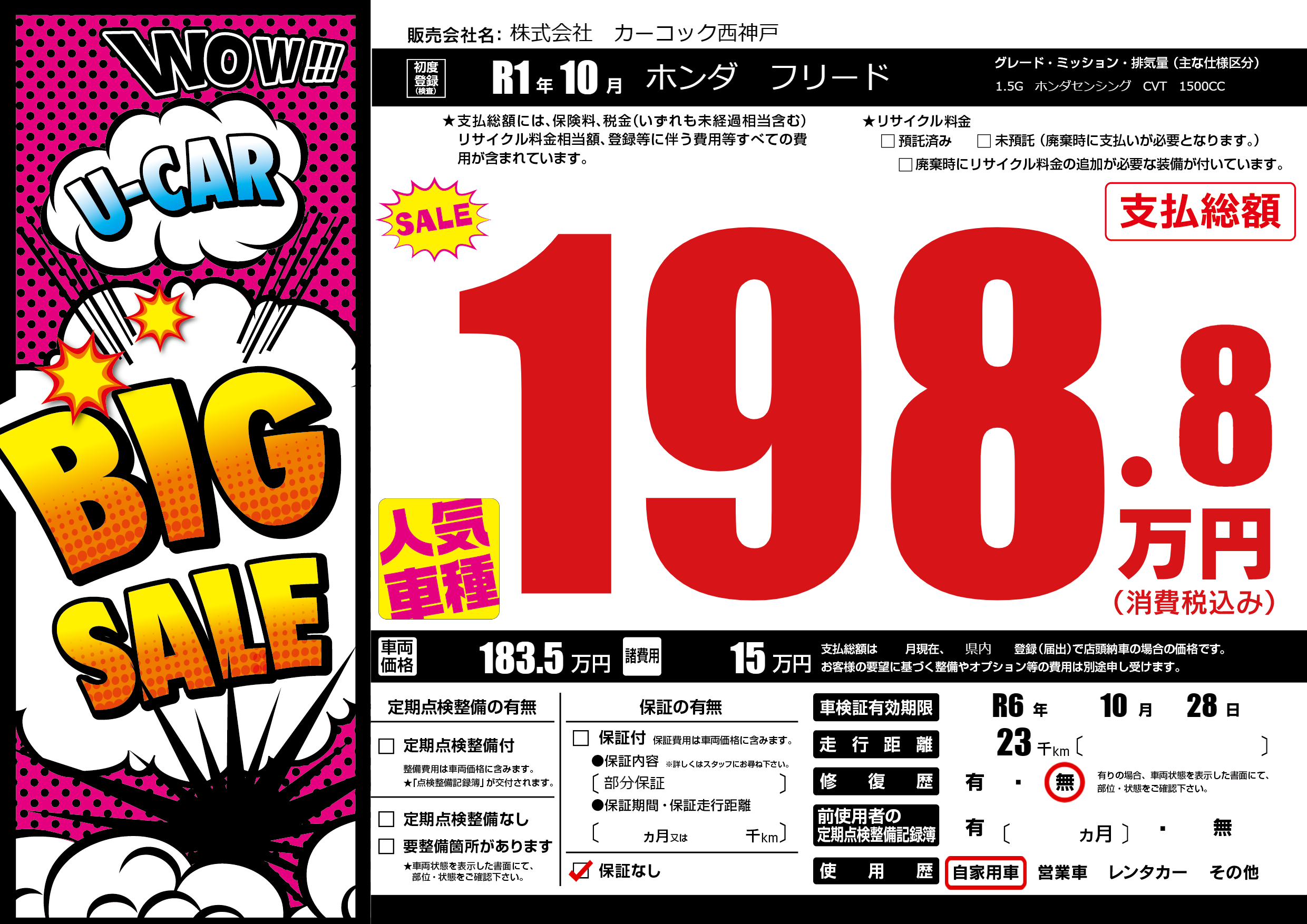 | 車名 | ホンダ フリード | グレード ミッション 排気量 |