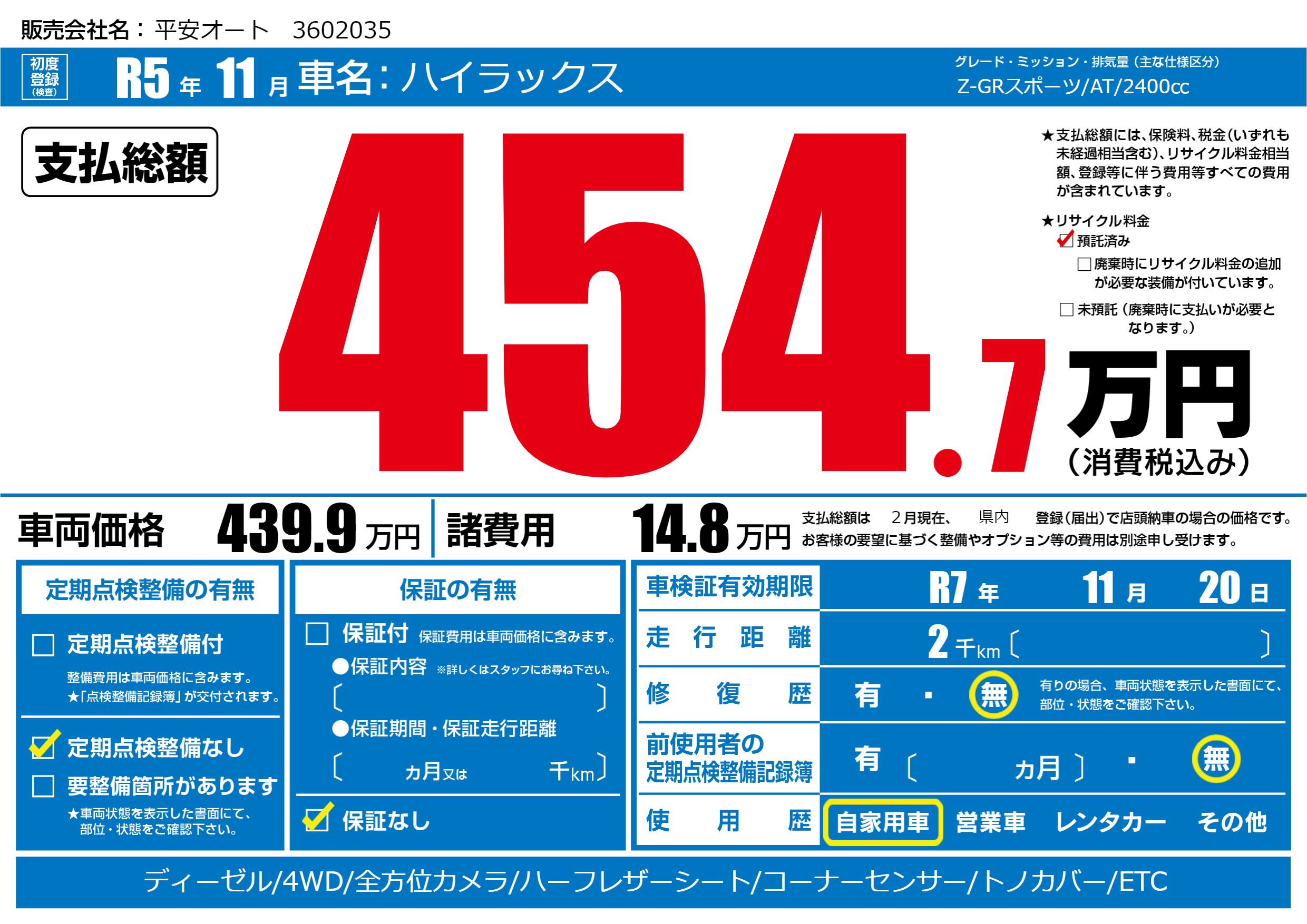 なし | 車検制限 | R7年11月20月 |