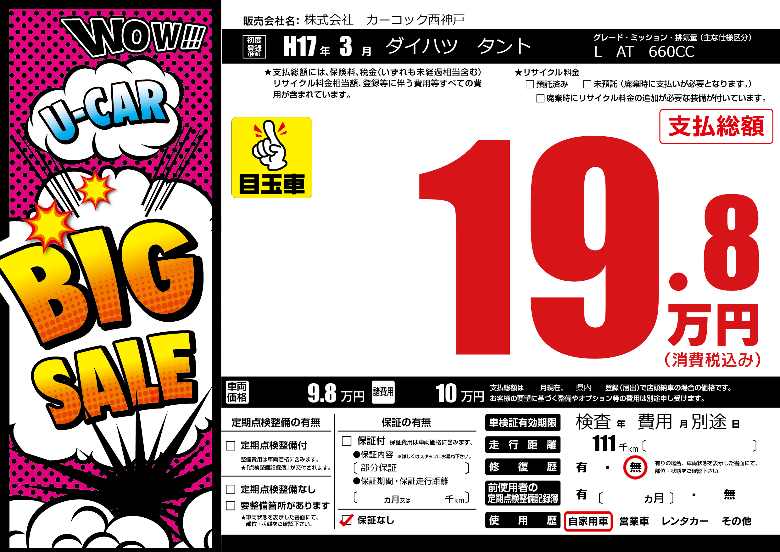 | 車名 | ダイハツ タント | グレード ミッション 排気量 |