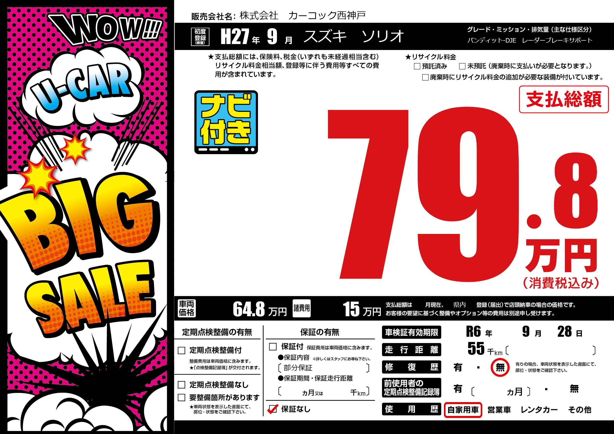 | 走行キロ | 5.5万km | 初年度登録 | H27年9月 |