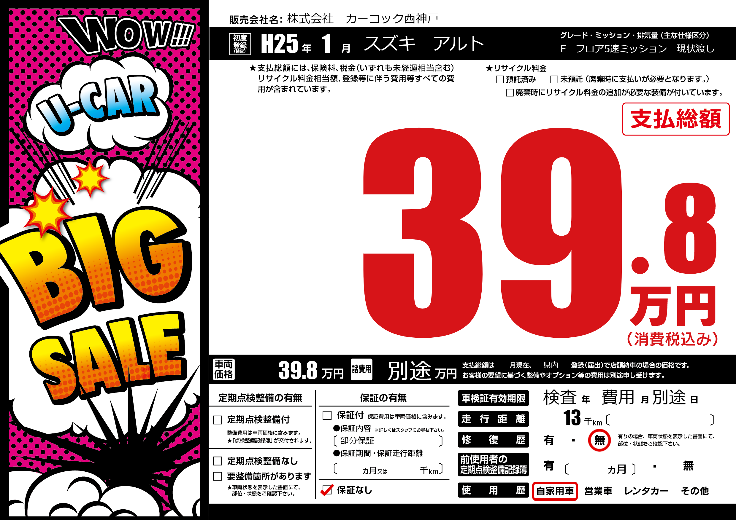 | 車名 | スズキ アルト | グレード ミッション 排気量 |
