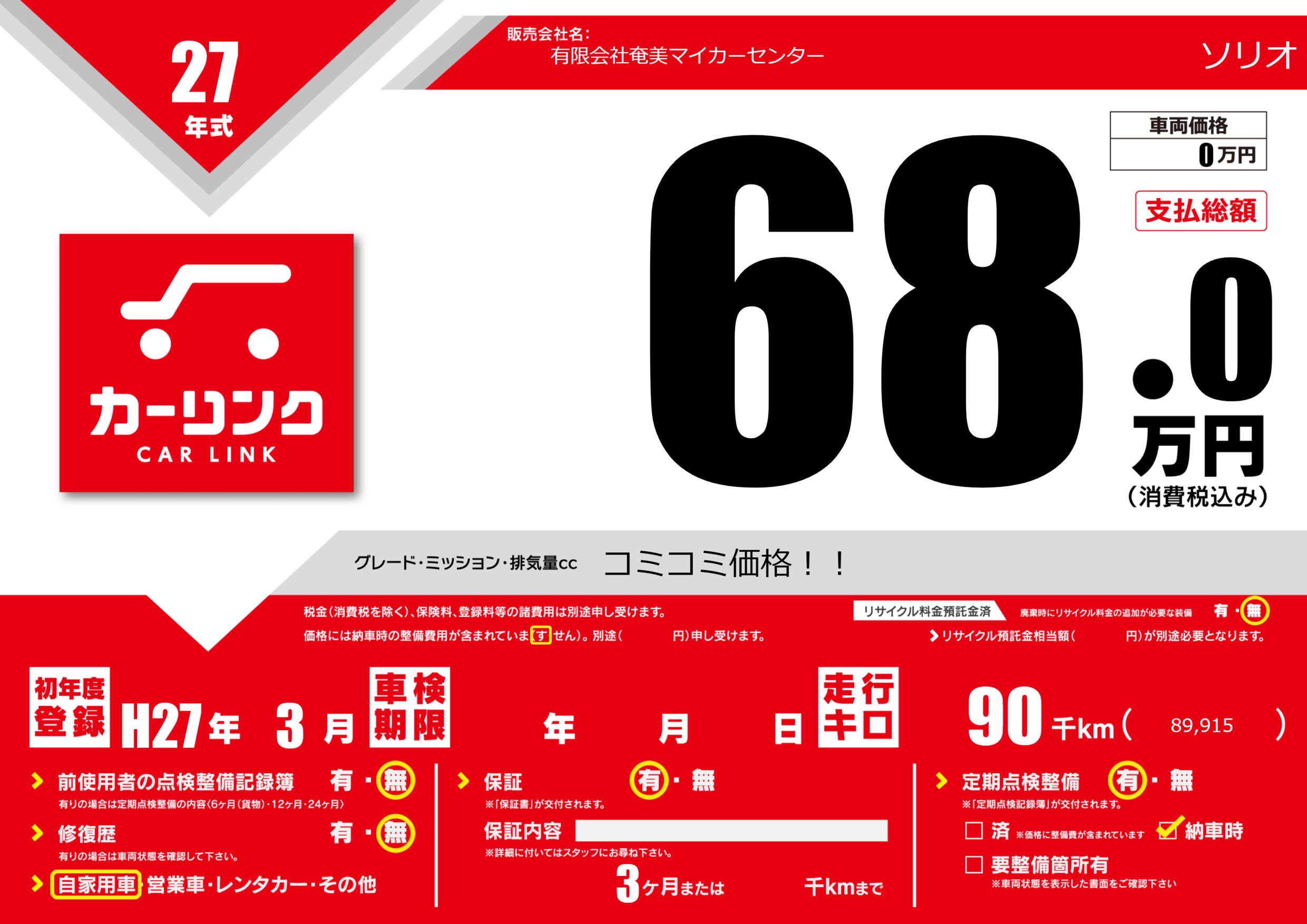| 走行キロ | 9万km | 初年度登録 | H27年3月 |