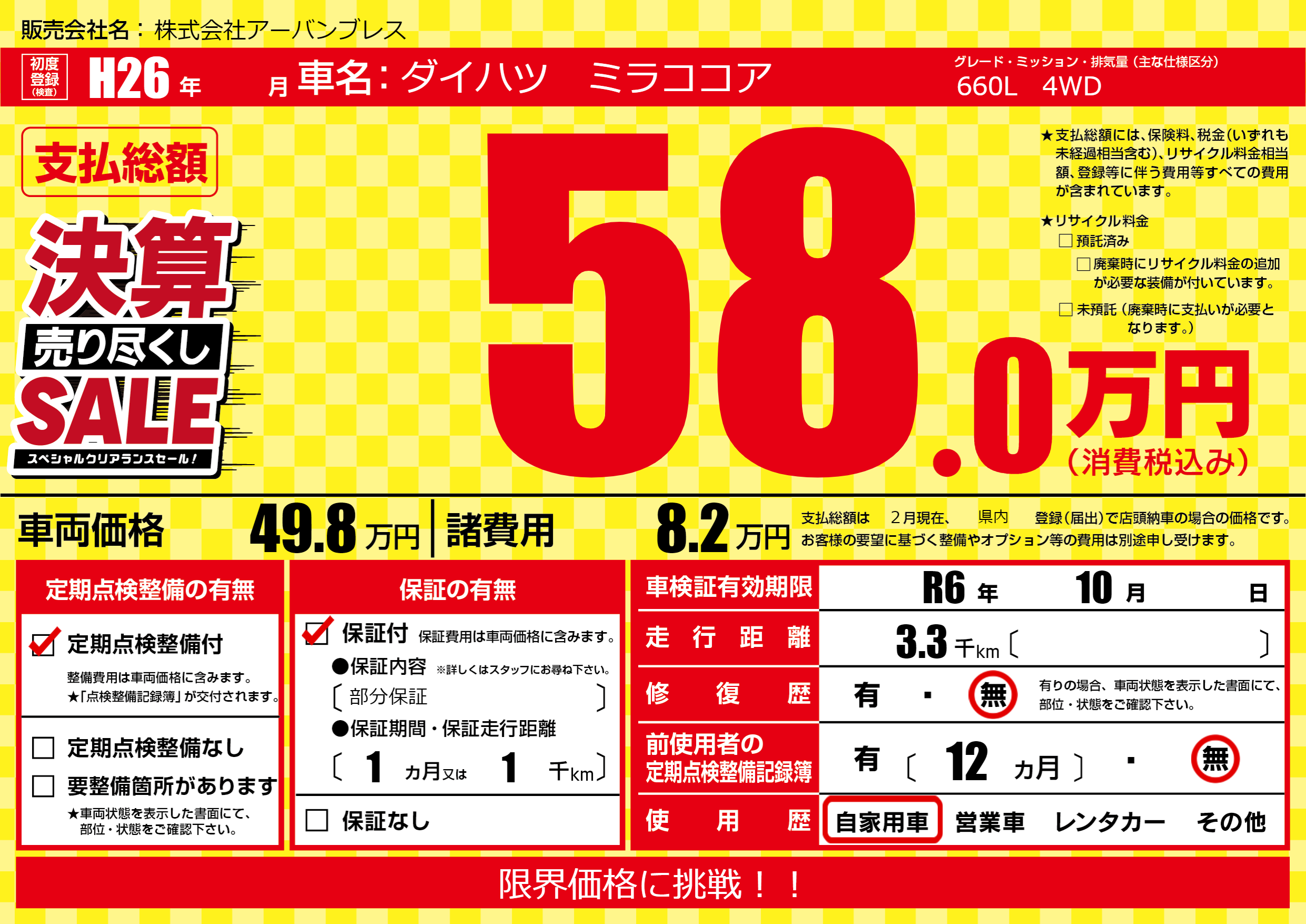 | 車名 | ダイハツ ミラココア | グレード ミッション 排気量 |
