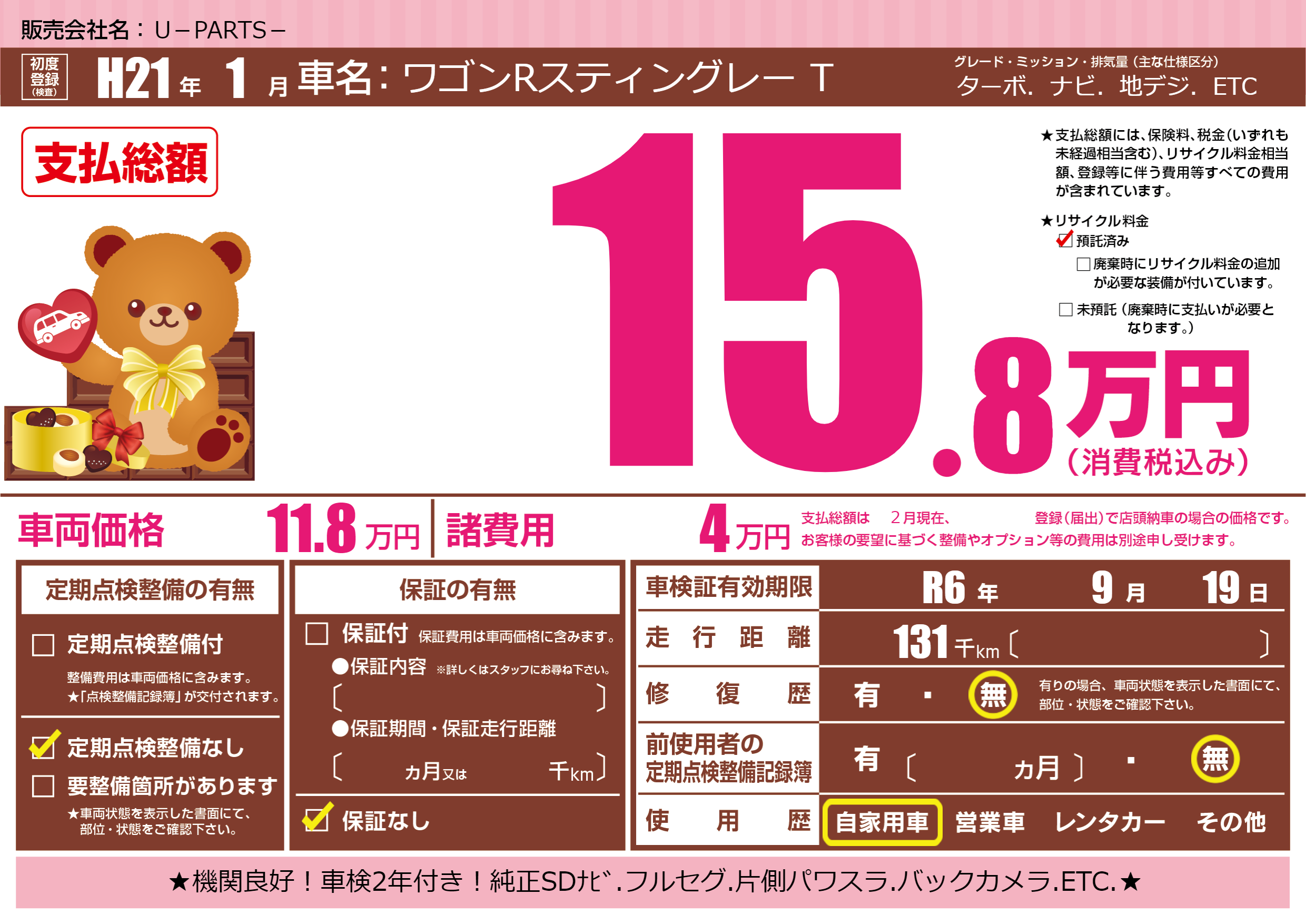 | 走行キロ | 13.1万km | 初年度登録 | H21年1月 |