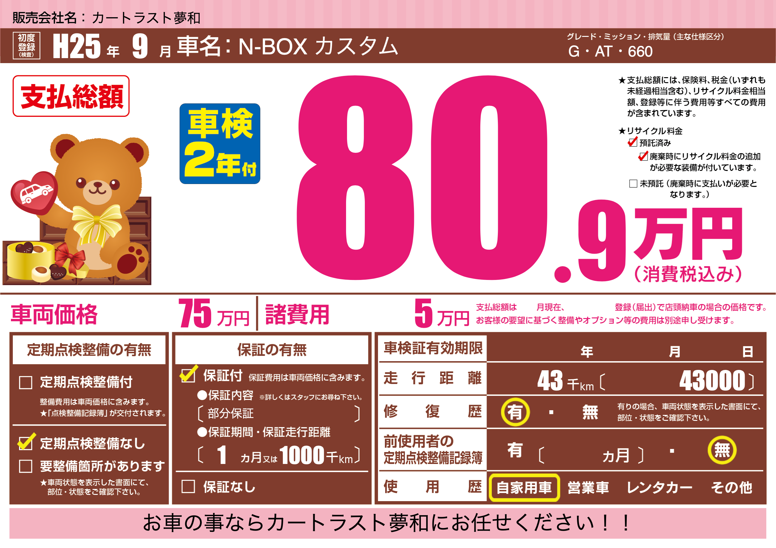 | 車名 | N-BOX カスタム | グレード ミッション 排気量 |