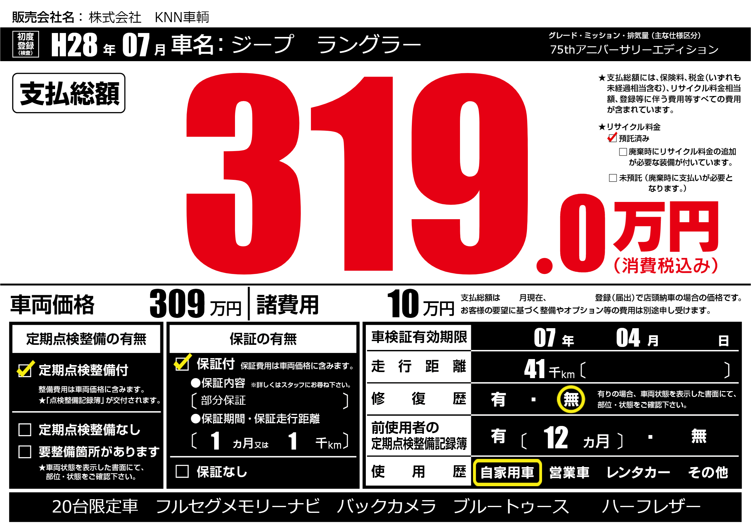 | 車名 | ジープ ラングラー | グレード ミッション 排気量 |