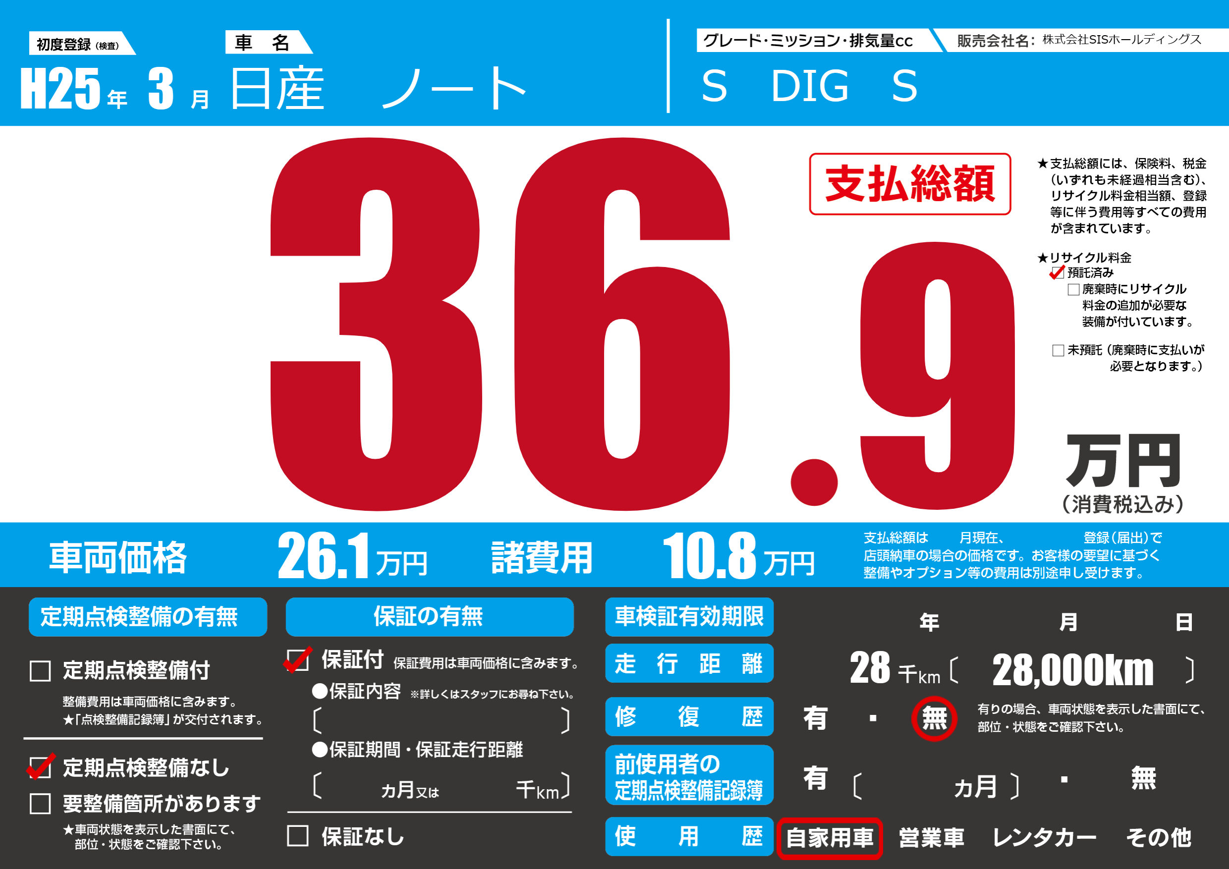 | 走行キロ | 2.8万km | 初年度登録 | H25年3月 |